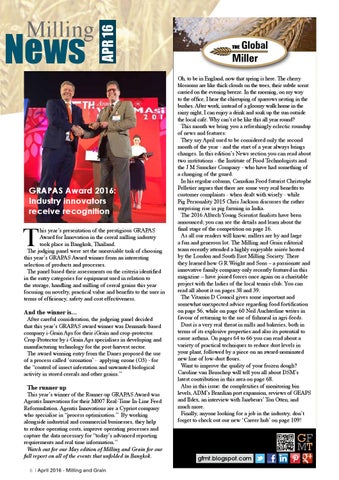 Oh, to be in England, now that spring is here. The cherry blossoms are like thick clouds on the trees, their subtle scent carried on the evening breeze. In the morning, on my way to the office, I hear the chirruping of sparrows nesting in the bushes. After work, instead of a gloomy walk home in the rainy night, I can enjoy a drink and soak up the sun outside the local café. Why can’t it be like this all year round? This month we bring you a refreshingly eclectic roundup of news and features: They say April used to be considered only the second month of the year - and the start of a year always brings changes. In this edition’s News section you can read about two institutions - the Institute of Food Technologists and the J M Smucker Company - who have had something of a changing of the guard. In his regular column, Canadian Food futurist Christophe Pelletier argues that there are some very real benefits to customer complaints - when dealt with wisely - while Pig Personality 2015 Chris Jackson discusses the rather surprising rise in pig farming in India. The 2016 Alltech Young Scientist finalists have been announced; you can see the details and learn about the final stage of the competition on page 16. As all our readers will know, millers are by and large a fun and generous lot. The Milling and Grain editorial team recently attended a highly enjoyable soirée hosted by the London and South East Milling Society. There they learned how G R Wright and Sons – a passionate and innovative family company only recently featured in this magazine – have joined forces once again on a charitable project with the ladies of the local tennis club. You can read all about it on pages 38 and 39. The Vitamin D Council gives some important and somewhat unexpected advice regarding food fortification on page 56, while on page 60 Neil Auchterline writes in favour of returning to the use of fishmeal in agri-feeds. Dust is a very real threat in mills and bakeries, both in terms of its explosive properties and also its potential to cause asthma. On pages 64 to 66 you can read about a variety of practical techniques to reduce dust levels in your plant, followed by a piece on an award-nominated new line of low-dust flours. Want to improve the quality of your frozen dough? Caroline van Benschop will tell you all about DSM’s latest contribution in this area on page 68. Also in this issue: the complexities of monitoring bin levels, ADM’s Brazilian port expansion, reviews of GEAPS and Ildex, an interview with Jaarbeurs’ Ton Otten, and much more. Finally, anyone looking for a job in the industry, don’t forget to check out our new ‘Career hub’ on page 109!
