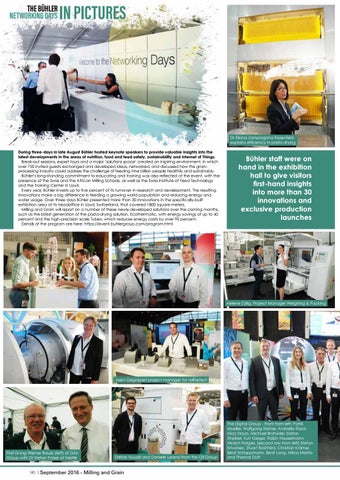 Dr Eliana Zamprognna Rosenfeld explains efficiency in pasta drying During three-days in late August Bühler hosted keynote speakers to provide valuable insights into the latest developments in the areas of nutrition, food and feed safety, sustainability and Internet of Things. Break-out sessions, expert tours and a major ‘solutions space’ created an inspiring environment, in which over 750 invited guests exchanged and developed ideas, networked, and discussed how the grainprocessing industry could address the challenge of feeding nine billion people healthily and sustainably. Bühler’s long-standing commitment to educating and training was also reflected at the event, with the presence of the Swiss and the African Milling Schools, as well as the Swiss Institute of Feed Technology and the Training Center in Uzwil. Every year, Bühler invests up to five percent of its turnover in research and development. The resulting innovations make a big difference in feeding a growing world population and reducing energy and water usage. Over three days Bühler presented more than 30 innovations in the specifically-built exhibition area at its headoffice in Uzwil, Switzerland, that covered 1800 square meters. Milling and Grain will report on a number of these newly-developed solutions over the coming months, such as the latest generation of the pasta-drying solution, Ecothermatic, with energy savings of up to 40 percent and the high-precision scale Tubex, which reduces energy costs by over 90 percent. Details of the program are here: https://event.buhlergroup.com/program.html