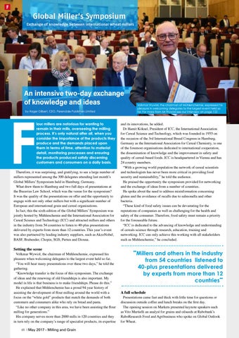 Volkmar Wywiol, the chairman of Mühlenchemie, expressed his pleasure when welcoming delegates to the largest event held so far. “You will hear many presentations over these two days,” he told the gathering. “Knowledge transfer is the focus of this symposium. The exchange of ideas and the renewing of old friendships is also important. My model in life is that business is to make friendships. Please do this.” He explained that Mühlenchemie has a proud 94 year history of assisting the development of flour milling around the world with a focus on the “white gold” products that match the demands of both customers and consumers alike who rely on bread and pasta. “Like no other company in this area, we have been assisting the flour milling for generations.” His company serves more than 2000 mills in 120 countries and they in turn rely on the company’s range of specialist products, its expertise 48 | May 2017 - Milling and Grain