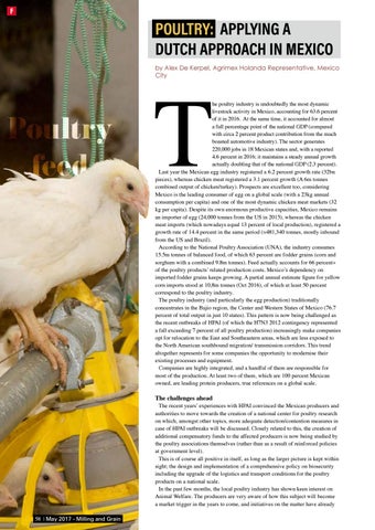 The recent years’ experiences with HPAI convinced the Mexican producers and authorities to move towards the creation of a national center for poultry research on which, amongst other topics, more adequate detection/contention measures in case of HPAI outbreaks will be discussed. Closely related to this, the creation of additional compensatory funds to the affected producers is now being studied by the poultry associations themselves (rather than as a result of reinforced policies at government level). This is of course all positive in itself, as long as the larger picture is kept within sight; the design and implementation of a comprehensive policy on biosecurity including the upgrade of the logistics and transport conditions for the poultry products on a national scale. In the past few months, the local poultry industry has shown keen interest on Animal Welfare. The producers are very aware of how this subject will become a market trigger in the years to come, and initiatives on the matter have already 58 | May 2017 - Milling and Grain