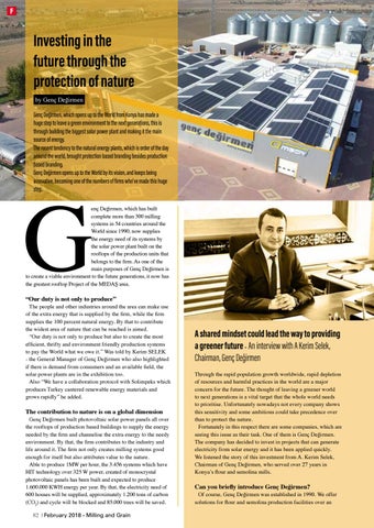 Genç Değirmen built photovoltaic solar power panels all over the rooftops of production based buildings to supply the energy needed by the firm and channelise the extra energy to the needy environment. By that, the firm contributes to the industry and life around it. The firm not only creates milling systems good enough for itself but also attributes value to the nature. Able to produce 1MW per hour, the 3.456 systems which have HIT technology over 325 W power, created of monocrystal photovoltaic panels has been built and expected to produce 1.600.000 KWH energy per year. By that, the electricity need of 600 houses will be supplied, approximately 1.200 tons of carbon (CO2) and cycle will be blocked and 85.000 trees will be saved. 82 | February 2018 - Milling and Grain