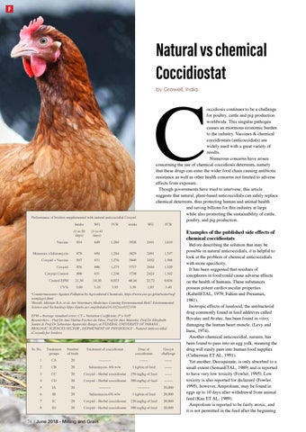 occidiosis continues to be a challenge for poultry, cattle and pig production worldwide. This singular pathogen causes an enormous economic burden to the industry. Vaccines & chemical coccidiostats (anticoccidials) are widely used with a great variety of results. Numerous concerns have arisen concerning the use of chemical coccidiosis deterrents, namely that these drugs can enter the wider food chain causing antibiotic resistance as well as other health concerns not limited to adverse effects from exposure. Though governments have tried to intervene, this article suggests that natural, plant-based anticoccidials can safely replace chemical deterrents, thus protecting human and animal health and saving billions for this industry at large while also promoting the sustainability of cattle, poultry, and pig production. FCR