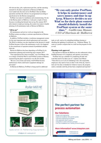 F All relevant data, jobs, replacement part lists, and the operating manuals for all plant components at Harinas de Mallorca were loaded onto the mini server (ProPlant Cube) by Bühler specialists and then the software was programmed according to specifications by the Harinas management. ProPlant was ready for installation and commissioning. On site at the Harinas plant on Mallorca, it took just a couple of hours because everything had already been set up. By summer 2017, after intensive employee training, the system was ready to handle planning of all maintenance tasks at Harinas de Mallorca.