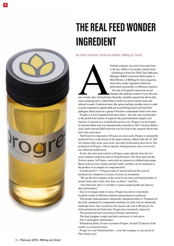 By Matt Holmes, Features editor, Milling & Grain Finnish company says resin from pine trees is the key additive for healthy animal feeds. Exhibiting at EuroTier 2018, Eija Valkonen, Manager (R&D) at Suomen Rehu spoke to Matt Holmes, of Milling & Grain magazine, about the wonder ingredient which has performed successfully in different countries. The idea of Progres® comes from an old Finnish folk medicine wisdom: if you rub rosin into wounds, they will heal faster. Recently, scientific research has shown that rosin-containing salve, indeed helps to heal even severe chronic sores and infected wounds. Coniferous trees, like spruce and pine, produce resin, in order to protect themselves against bark and wood-boring insects and microbial pathogens. Resin acids are a group of bioactive compounds found in tree resin. Progres is a novel patented feed innovation – the only resin acid product in the global feed market. It supports the gastrointestinal integrity and function of animals in a scientifically proven way. Progres was developed by Suomen Rehu and was internationally launched in 2015. Suomen Rehu’s wide, multi-national R&D network was involved in the research efforts that led to this innovation. The bioactive component of Progres are resin acids. Progres is sustainably produced from a side-stream of the paper industry called crude tall oil. Tall oil contains fatty acids, resin acids, and other hydrocarbon derivatives. The production of Progres, with its specific refining process, does not involve any chemical modification. In fact, the resin acid cocktail in Progres comes directly from the two most common coniferous trees in Finnish forests: The Scots pine and the Norway spruce. In Progres, resin acids are present in a defined percentage. Resin acids are non-volatile and heat stable, and they can be measured in the product or in samples of compound feed. It needs just 0.5 – 1.0 kg per tonne of animal feed and the costs of inclusion are competitive in terms of return on investment. “We are the first company in the world to use resin acid-based product in animal feeds and it really does have an effect,” said Eija. “Our field trials show it can help to sustain animal health and improve their performance.” Due to its unique mode of action, Progres has shown consistently excellent results in different countries and production conditions. The product demonstrated a statistically significant effect in 70 percent of the trials completed by independent institutes. In trials with an intentional challenge factor, like coccidiosis, the success rate rose to 80 percent. In both institutional and field trials, Progres has consistently improved: The growth and feed conversion of broilers and turkeys The final slaughter weight and feed conversion of veal calves Sow’s and piglets’ performance Finland has plenty of trees to produce Progres. Around 75 percent of the country is covered in forest. Proges is a very Finnish product – a fact the company is very proud of. The website says:
