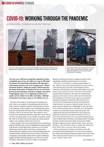 Over the years, Chief has developed the reputation of being a handshake, face-to-face, let’s talk over a cup of coffee kind of company. We acknowledge and embrace the importance of the human element as one of our strongest assets. What is the human element? Simply put, people. Chief incorporates the human element into our business because we are trusted, provide personal attention, and believe in dignity and respect. Using language such as “we�, displaying our history, our people, and our culture in our offices and online. Although circumstances may keep us apart, we are still here for you. Necessity is the mother of invention and we honestly never know what we are capable of accomplishing until our feet are held to the fire. Companies, families, and individuals are rising to the challenge, coming together, and contributing their best to keep the world spinning with some sense of normalcy. With feet to the fire, Chief is not missing a beat. We continue to move forward while maintaining an effective approach to work with our customers around the globe. As you read this, somewhere around the world we are delivering on-time quotes, providing customer support, and completing remote start up services. A prime example is the recent commissioning of two crucial drying projects in Zambia where a string of inadequate harvests has resulted in the decrease of food staples and an increase in cost. Providing efficient and consistent airflow, Chief dryers are being used to safeguard the early cropping of maize, securing the grain quality for food grade milling. Because time is always a factor, Chief dryers are shipped in preassembled modular units for quicker installation, suppling prompt and reliable operation, even in the most extreme of climates. Chief dryers are used for a variety of commodities; 60 | May 2020 - Milling and Grain