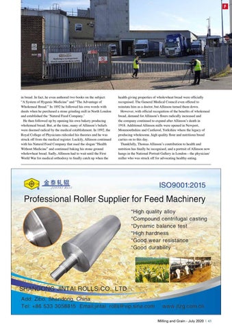 health-giving properties of wholewheat bread were officially recognised. The General Medical Council even offered to reinstate him as a doctor, but Allinson turned them down. However, with official recognition of the benefits of wholemeal bread, demand for Allinson’s flours radically increased and the company continued to expand after Allinson’s death in 1918. Additional Allinson mills were opened in Newport, Monmouthshire and Castlerod, Yorkshire where the legacy of producing wholesome, high quality flour and nutritious bread carries on to this day. Thankfully, Thomas Allinson’s contribution to health and nutrition has finally be recognised, and a portrait of Allinson now hangs in the National Portrait Gallery in London—the physician/ miller who was struck off for advocating healthy eating.