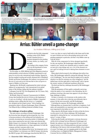The main reason, according to Roman Sonderegger, that the Arrius has been designed and developed the way it has is because producers in the milling and food industries are currently encountering an increasing number of challenges, with these issues requiring the innovative ideas and solutions that Bühler brings to its customers. Mr Sonderegger also stated that Bühler also sees digitalisation as a huge opportunity for both the company and their customers alike to use. Another factor that influenced the Arrius’ developement can be found in Bühler’s revolutionary new Mill E3 design. Introducing the Mill E3 project, Mr Sonderegger described the Mill E3 as 46 | December 2020 - Milling and Grain