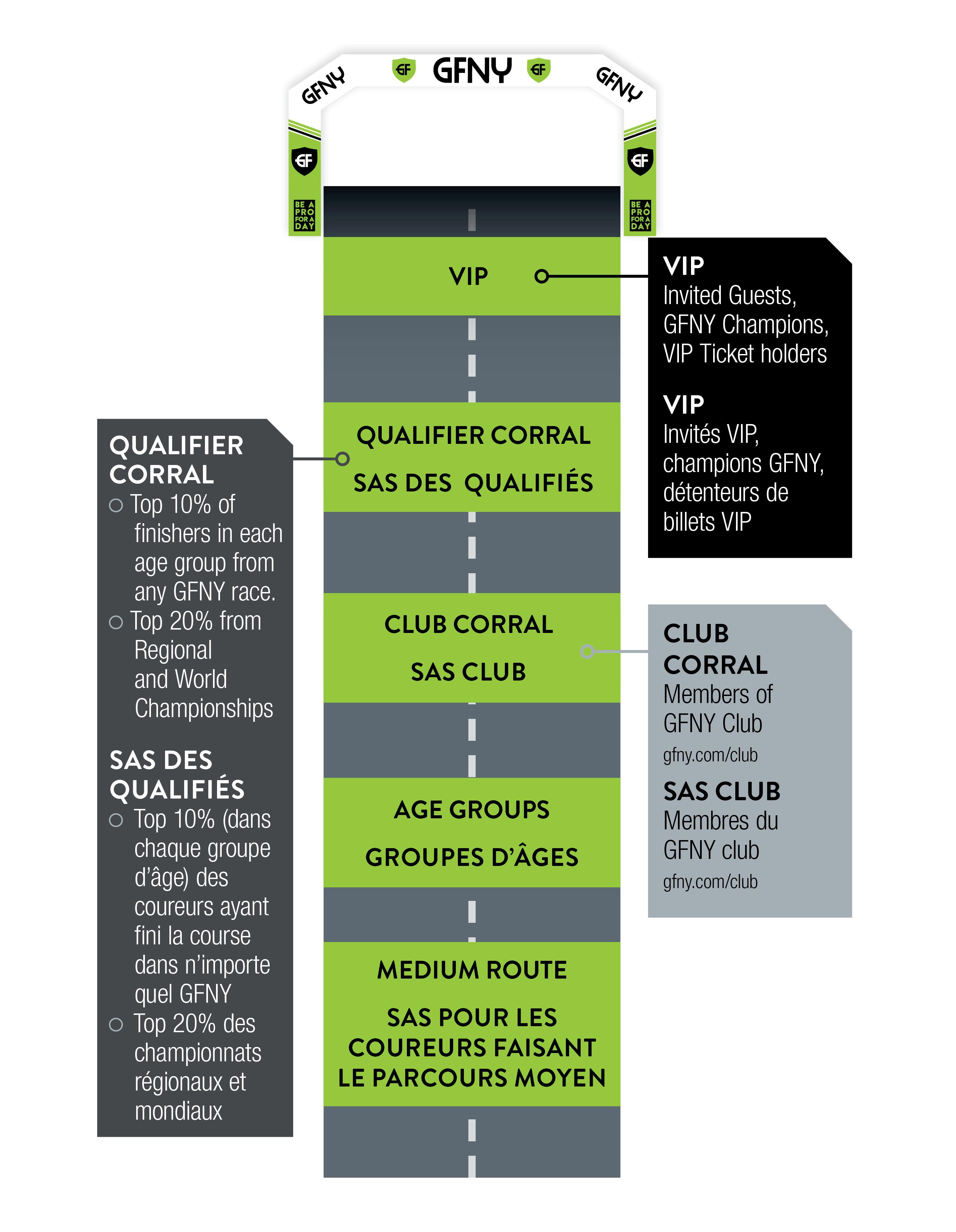 Top 10% of finishers in each age group qualify for racer corral at the GFNY World Championship NYC in May and GFNY World races for 380 days.