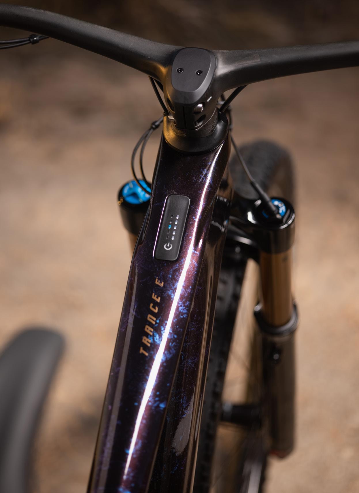 This all-new multipurpose control button is integrated into the top tube of the Trance X Advanced E+ Elite. It features an on/off button and colored LED lights to indicate support mode and battery level. With RideControl Go, there is no need for external wiring or additional handlebar-mounted control units.