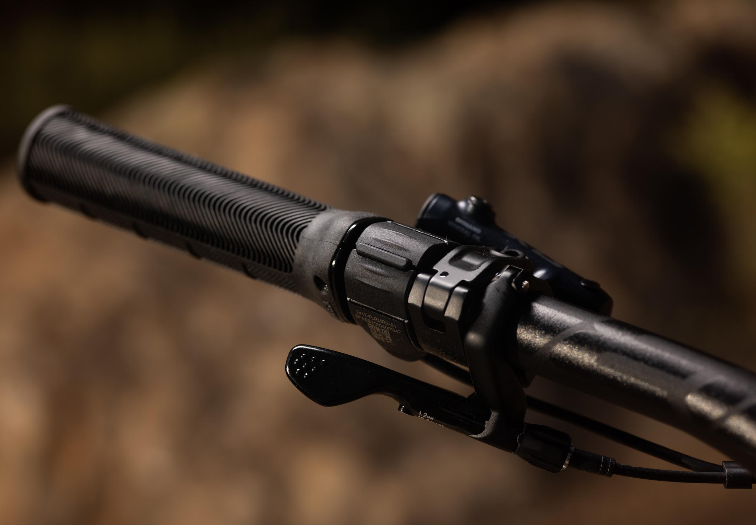 The second control unit, the new RideControl Ergo 3, is integrated with the handlebar grips. The grips that come on the Trance X Advanced E+ Elite are size-specific and tapered for ergonomic comfort. (The control units can also be used with any replacement grip.) Each remote has three buttons that can be set up for personal preference. The remote can be mounted on either side of the handlebar, and there’s an option to add a second Ergo 3 and have buttons on each side of the bar to control features such as walk-assist mode or lights.