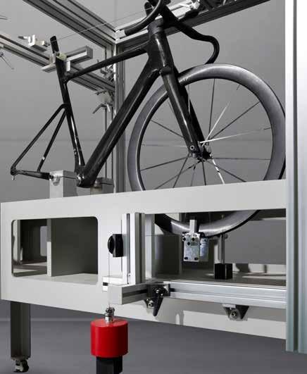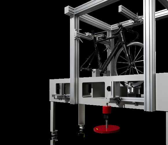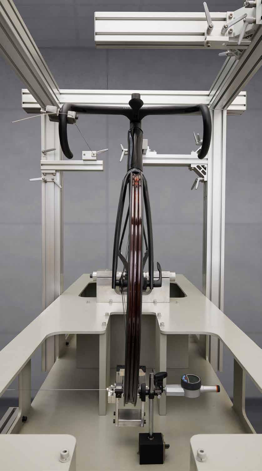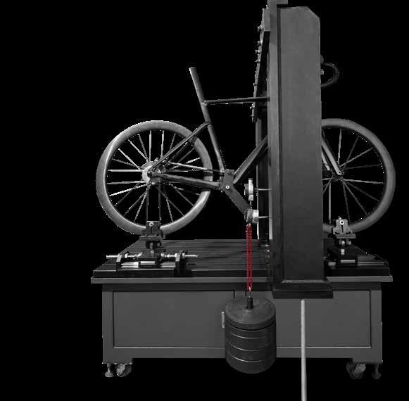 • Fixation Method: The frame is rigidly constrained at the bottom bracket, seatpost, and handlebar. A proprietary test jig is interfaced with the front wheel at its lowest point.