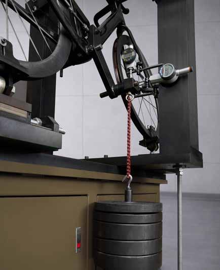 • For pedaling stiffness testing, both the rear dropouts and a dummy fork were fixed, with the frame inclined at 10° and a vertical force applied to the pedal eye of the crank arm. Higher stiffness in this area means efficient power transfer and minimal energy loss.