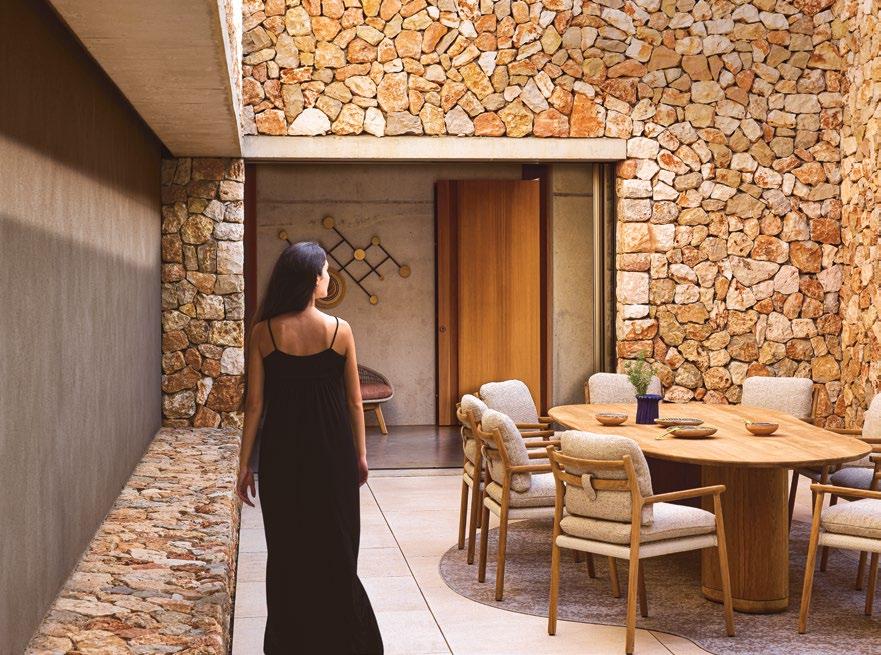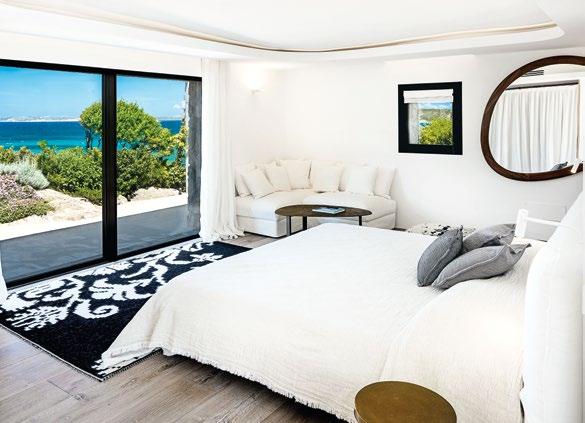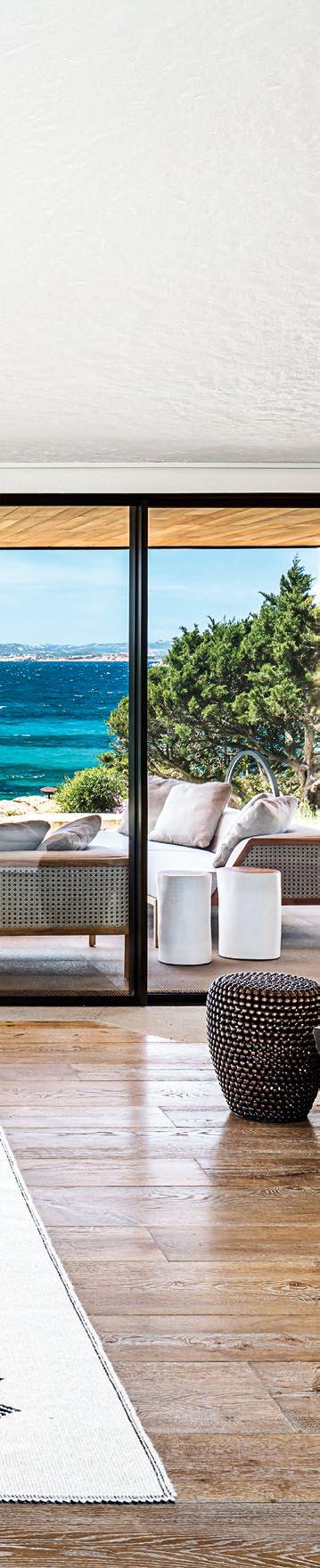 et un crépi clair. Située à deux pas de la plage, la villa aux lignes organiques se fond parfaitement dans le paysage de granit rose de la baie de Liscia di Vacca. L’architecture enveloppe la pièce centrale de la maison comme la perle d’une huître : le salon baigné de lumière avec cheminée. Celui-ci se prolonge naturellement par un patio qui mène à la cuisine, elle-même donnant accès à l’espace repas extérieur situé à l’arrière de la villa.