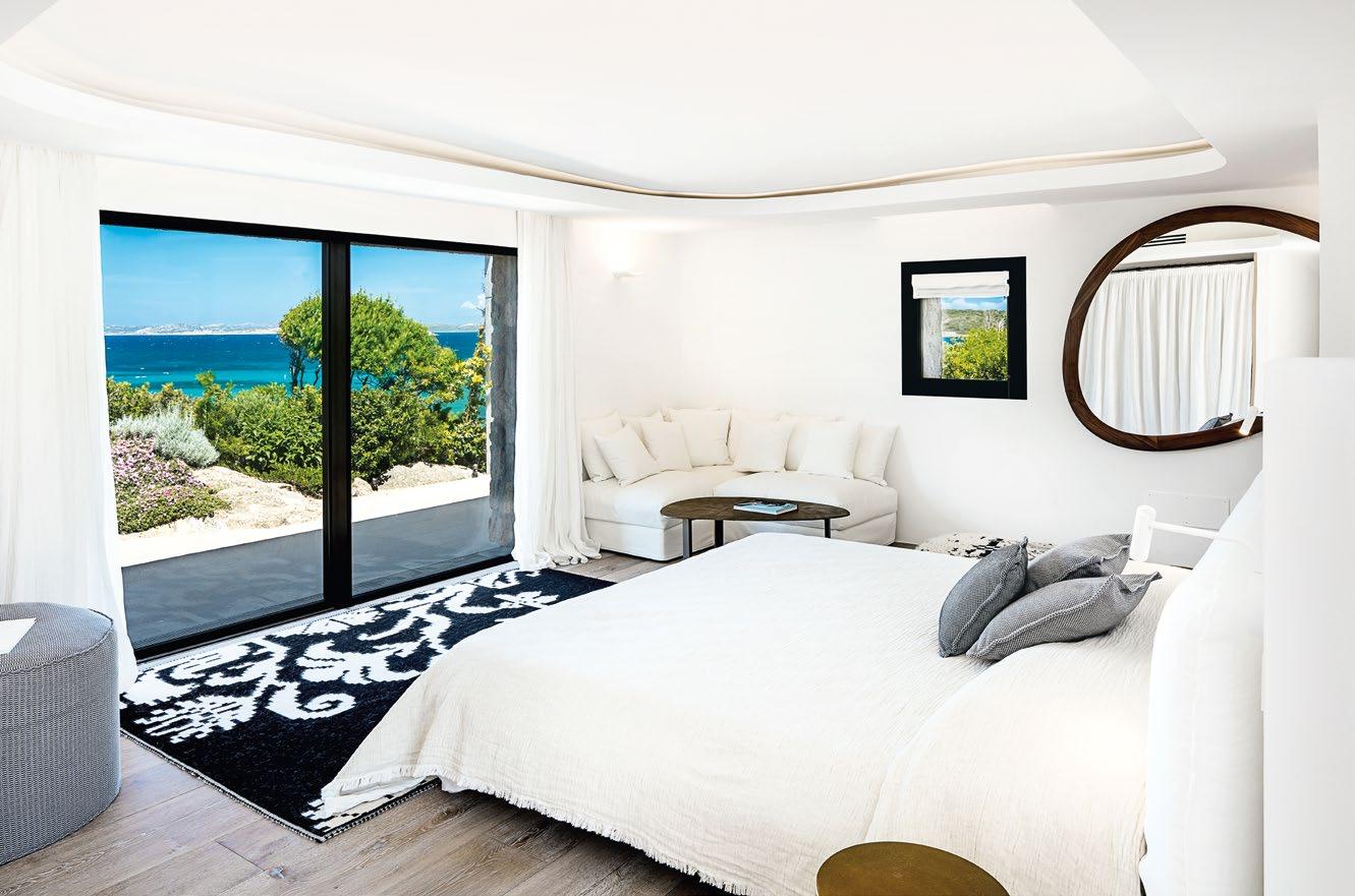 La symbiose entre le verre, le bois et la pierre crée à l’intérieur une atmosphère unique alliant un design contemporain à des éléments traditionnels de l’île. En entrant dans la villa, on est immédiatement frappé par l’extraordinaire vue sur la mer. Les hautes baies vitrées encadrent un panorama à couper le souffle qui englobe les îles situées en face, Cappuccini et Caprera.