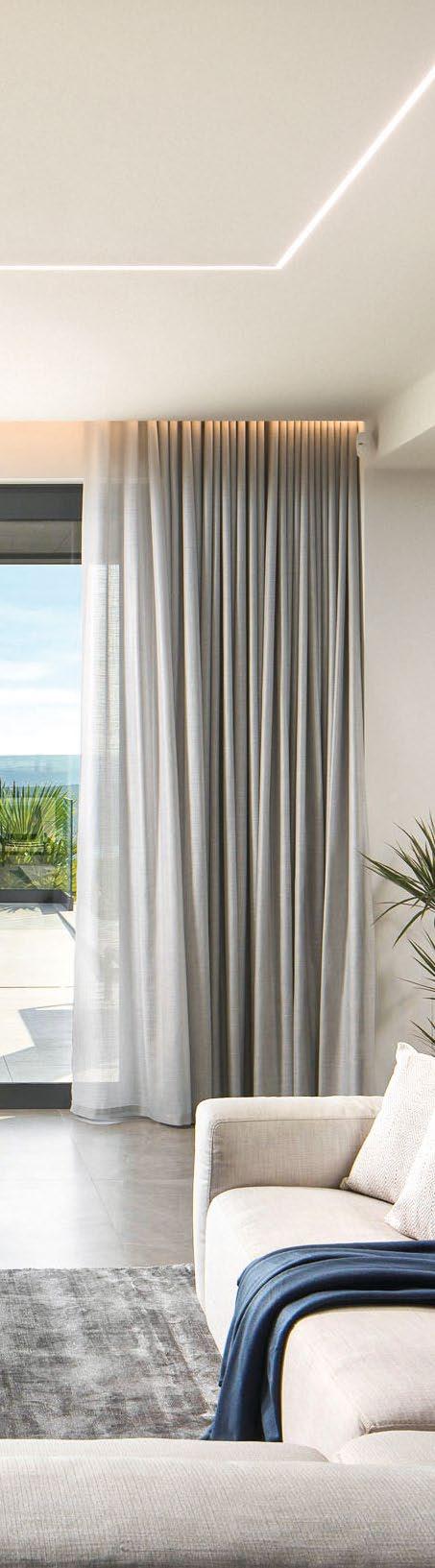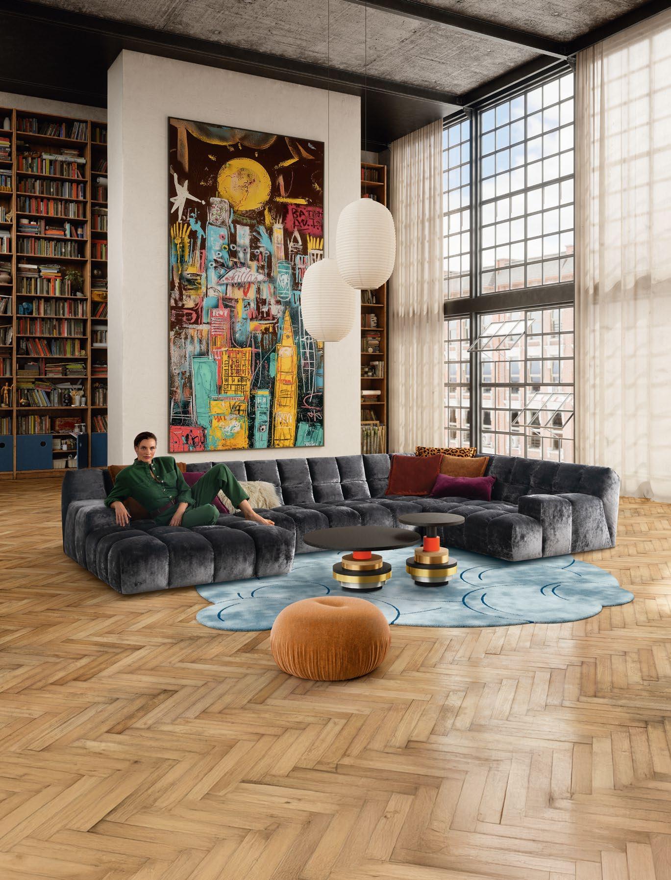 POLYVALENCE Depuis 1946, la PME familiale JAB Anstoetz Group se consacre au design d’intérieur en travaillant des étoffes nobles. La marque Chivasso fait partie du groupe depuis 25 ans. Sa nouvelle collection Let‘s celebrate met à l’honneur cette collaboration de longue date. La gamme Minimalist Luxury est dominée par des tons naturels allant du crème à l’anthracite. En voici un aperç u : le rideau Celebrity arbore des grands motifs en forme de losange, le tissu chenille du fauteuil est particulièrement résistant aux salissures grâce à une technologie spéciale.