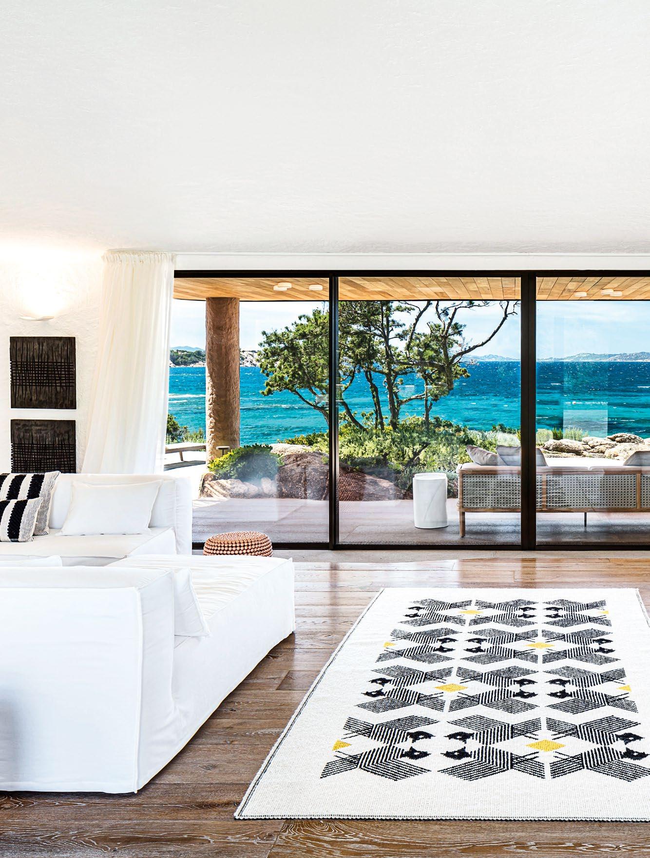 Les grandes fenêtres du salon offrent une belle vue sur la mer vert émeraude et les îles Cappuccini et Caprera.