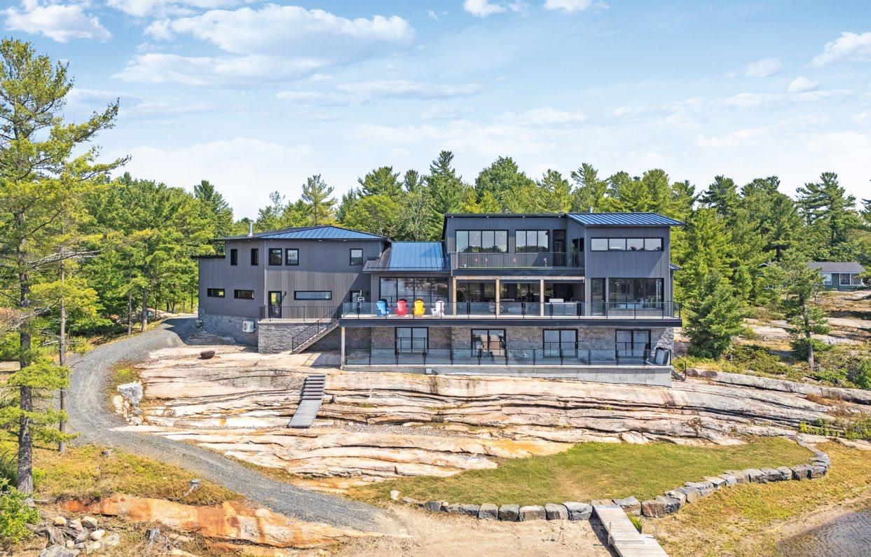 Rocciose in riva al lago, la tenuta comprende una cascata: uno scenario da Far West nel cuore del Canada . Su una superficie di oltre 1.142 m 2 , la casa principale ospita cinque camere, sette camini e una sala da pranzo.
