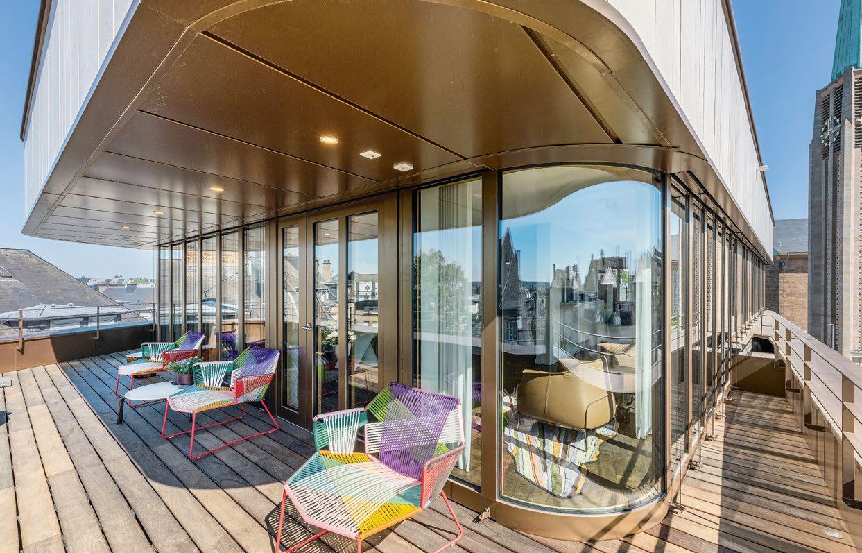 The top floor of the building houses the Seijaku Wellbeing Area, a sanctuary inspired by Japanese philosophy. Hand-crafted paper room dividers based on those found in traditional onsen, tatami mats and warm wood tones create quiet spaces in which to relax. A narrow staircase leads to the roof terrace, where guests can enjoy splendid views of the Rhine River and the rooftops of Basel.
