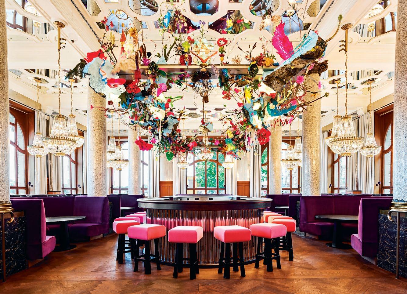 The opulent installation suspended above the bar is the work of artist duo Gerda Steiner & Jörg Lenzlinger.