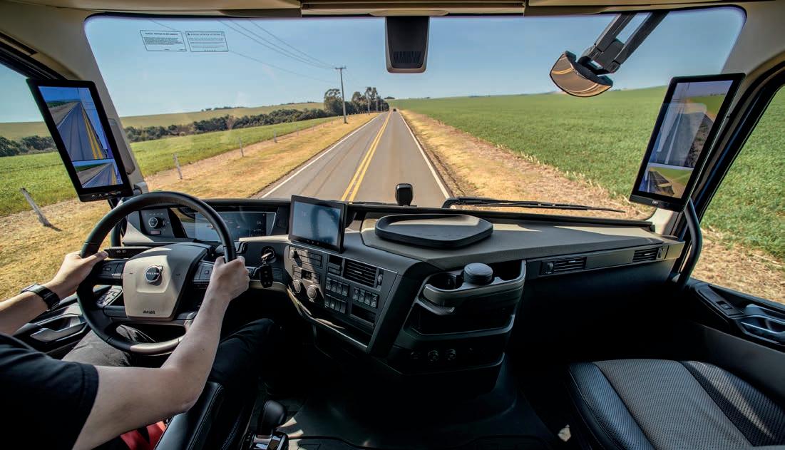 A novidade mais visível no novo FH são as câmeras substituindo os retrovisores. Essa tecnologia melhora a aerodinâmica da cabine, amplia a visibilidade do motorista e aumenta a segurança durante a condução. Mais eficientes que os espelhos retrovisores, as câmeras oferecem um campo de visão mais amplo e maior nitidez em condições de chuva, neblina e à noite, com o uso de luz infravermelha, conforme explica o gerente de engenharia de vendas da Volvo, Jeseniel Valério. “E durante o dia, as câmeras eliminam os ofuscamentos causados pelos reflexos dos espelhos tradicionais”, complementa.