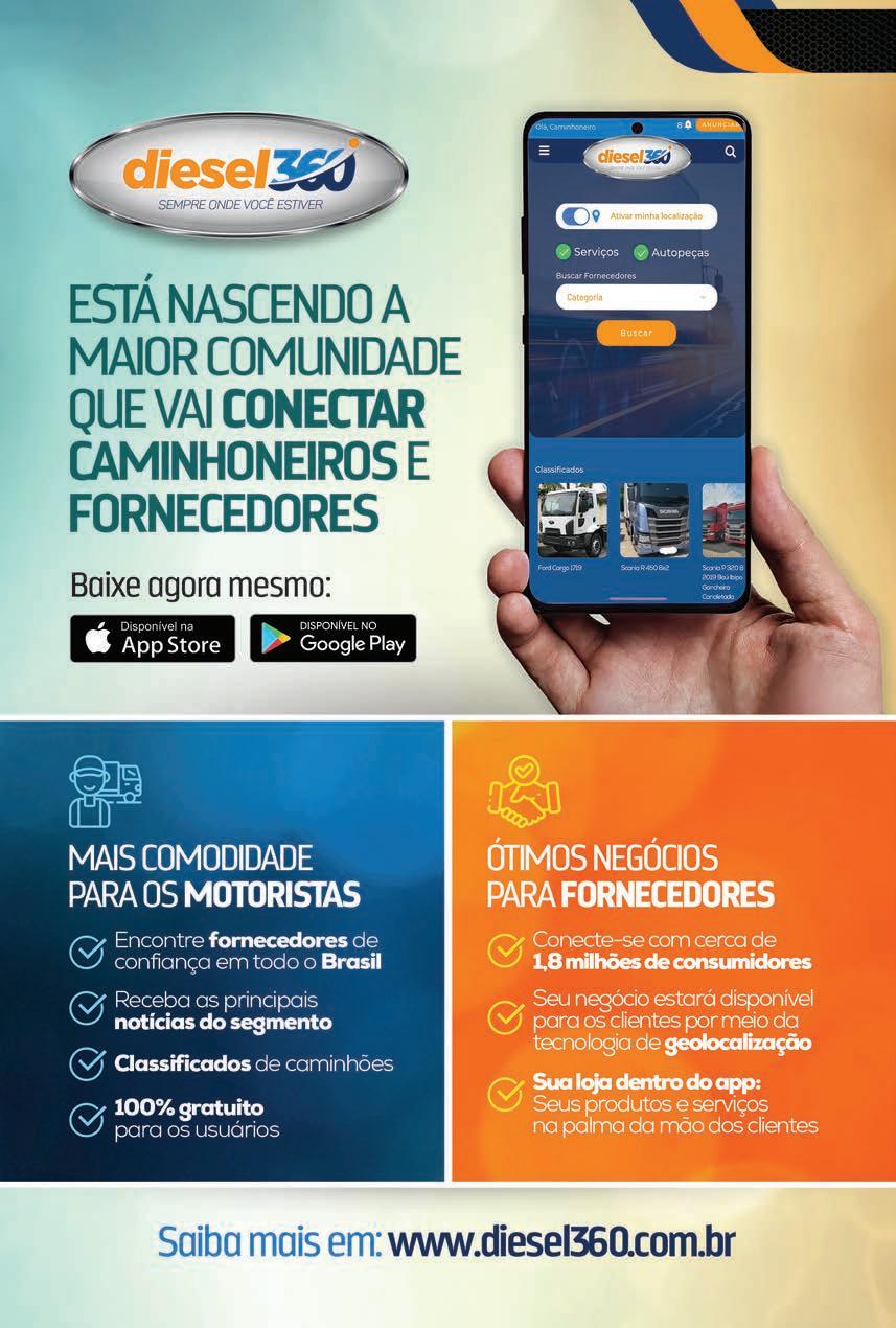 Mansberger acrescenta que um im portante diferencial do diesel360 em re lação aos tradicionais sistemas de loca lização geográfica existentes no País é a lista de produtos e serviços corretivos e preventivos mais próximos de onde o caminhão estiver. “Para garantir mais a segurança ao caminhoneiro, todos os fornecedores cadastrados no app são previamente verificados e classificados por outros usuários. Além disso, o mo torista encontra as concessionários de todas as marcas de caminhão reunidas num só lugar”, complementou.