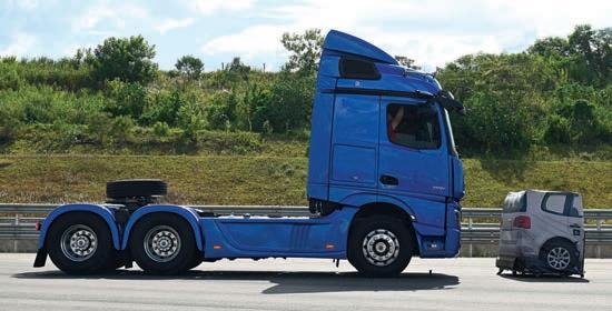 O Actros com cabine Space oferecida desde 2022. Abaixo, demonstração do assistente de frenagem no campo de provas