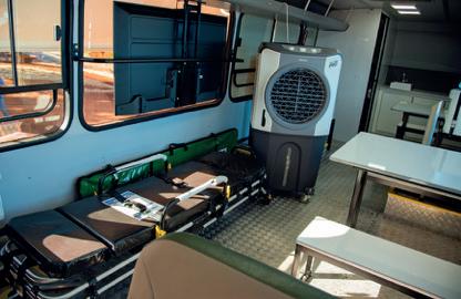 Direcionado a oito passageiros, por exemplo, pode agregar base avançada com mesa para refeição, bancos e itens como bebedouro, pia, geladeira, além de um ambulatório com maca fixa integrada, mais armário de medicamentos para suporte médico.