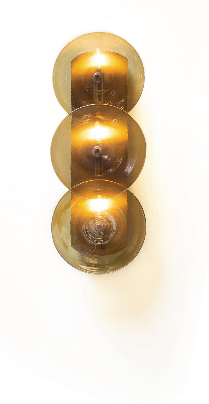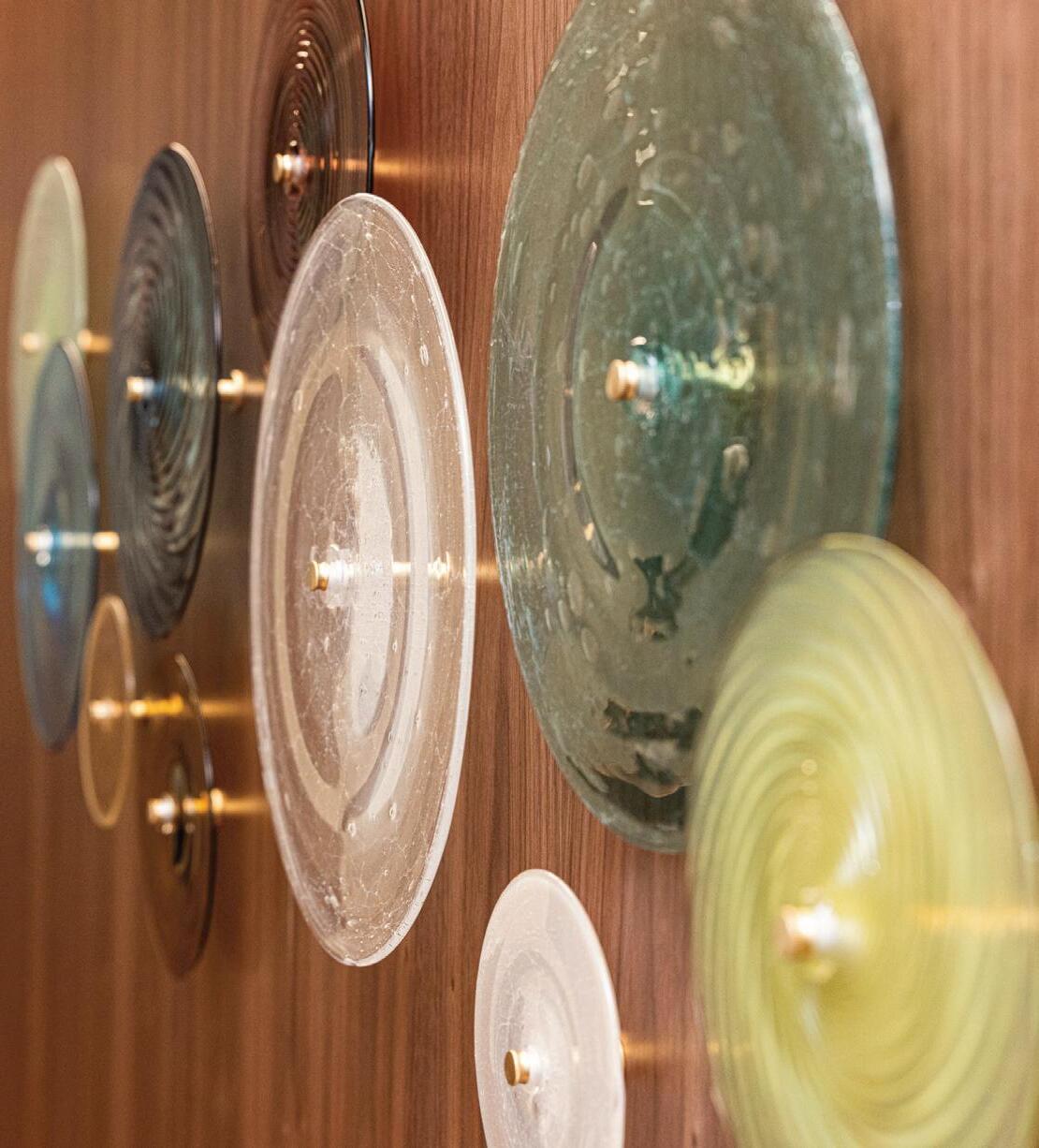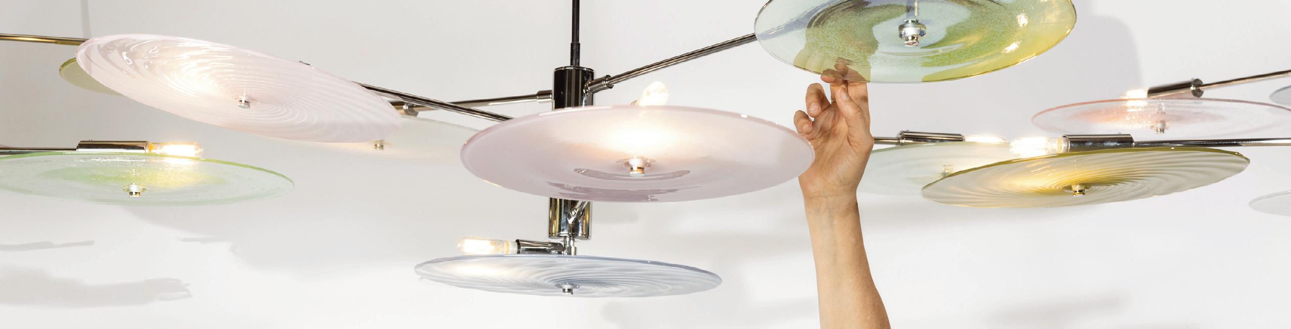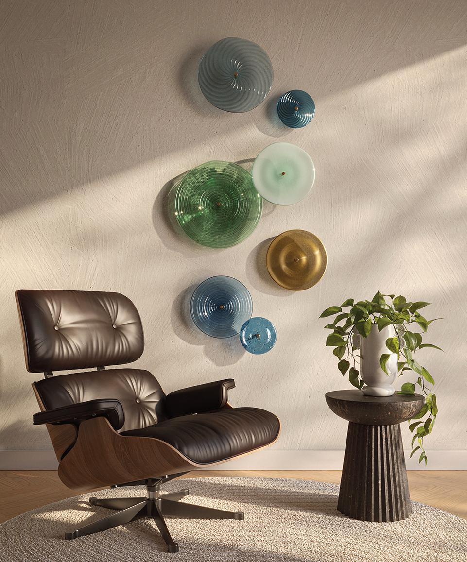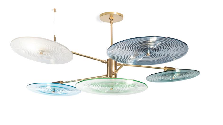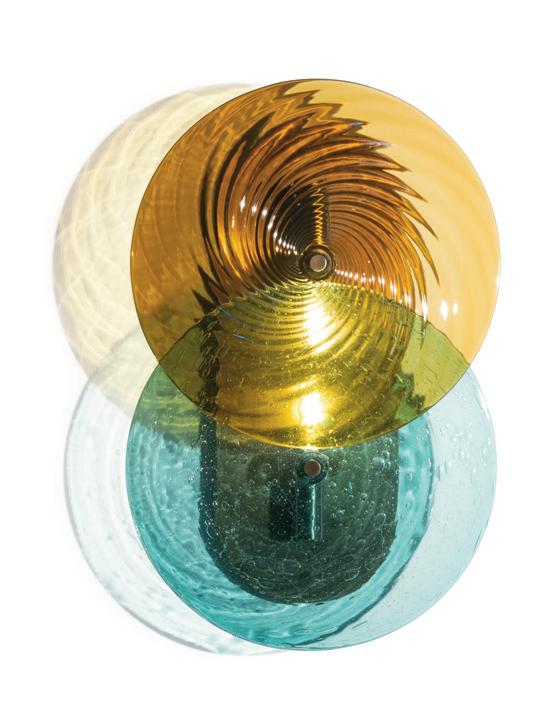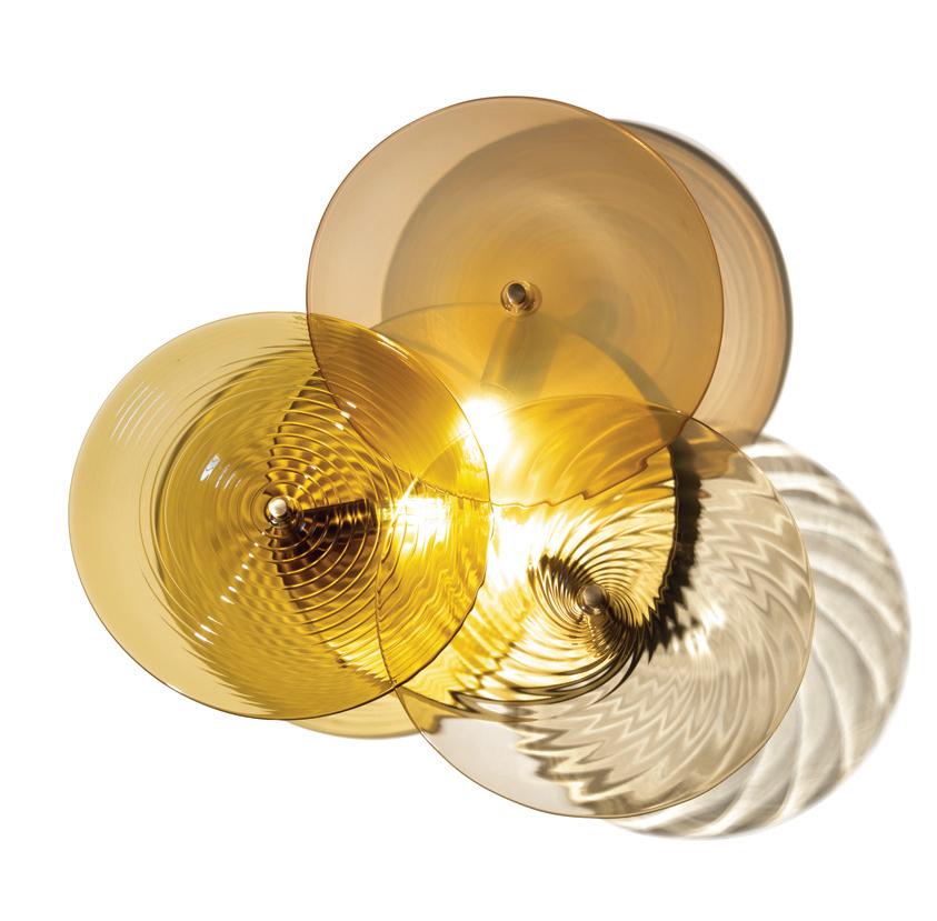 Light in motion. Inspired by the way light bends and radiates through glass, Lens explores depth and symmetry through softly glowing, hand-formed discs that shift in character from every angle.