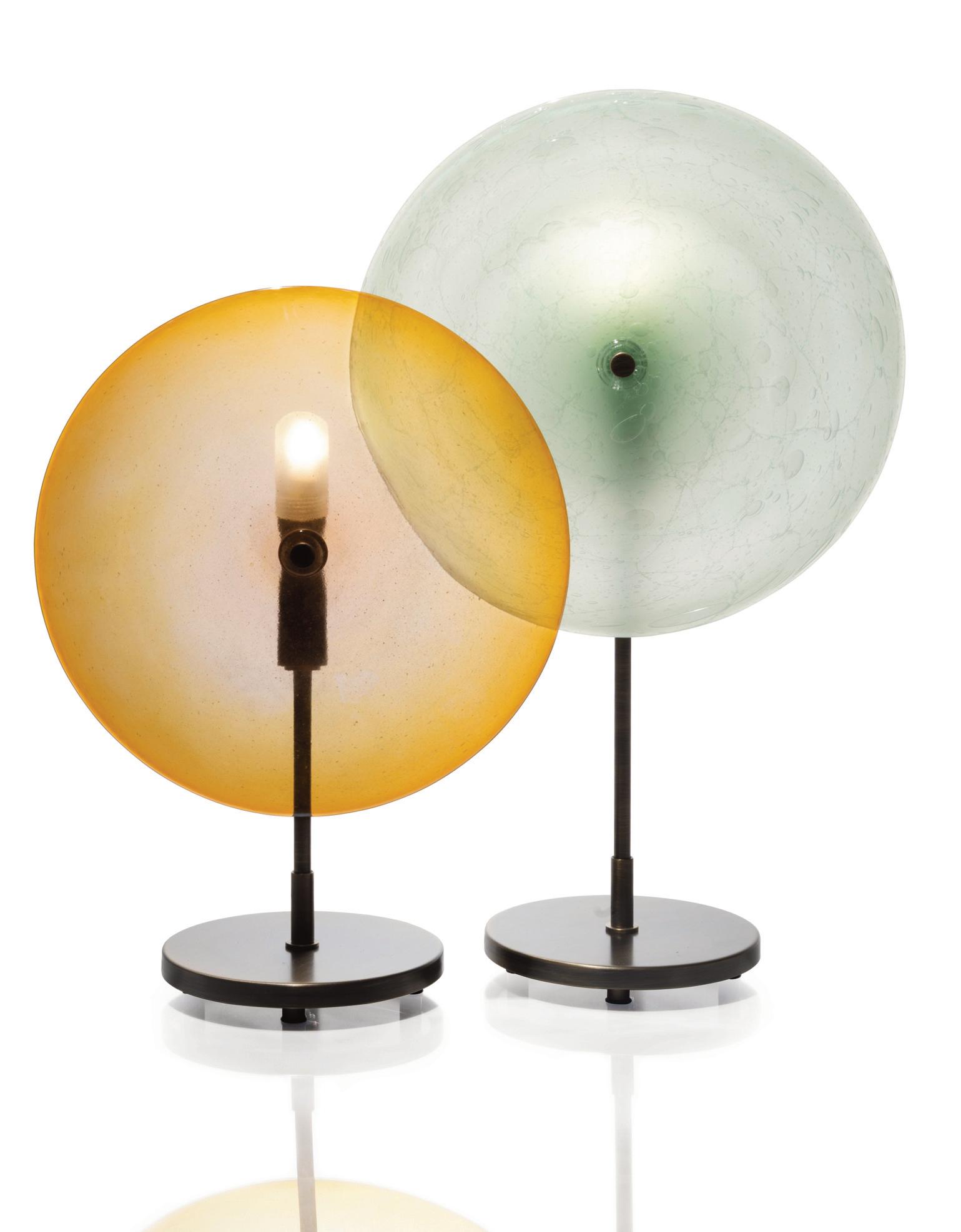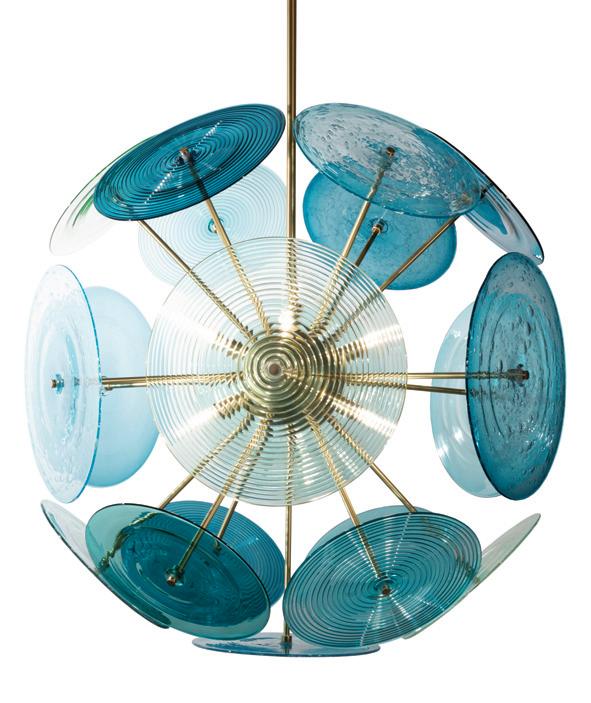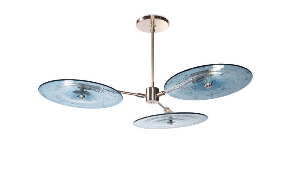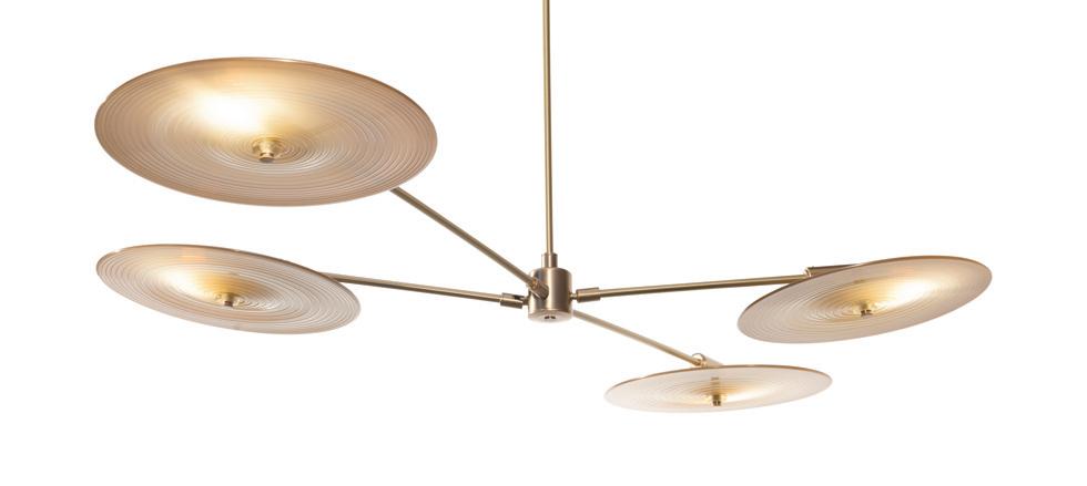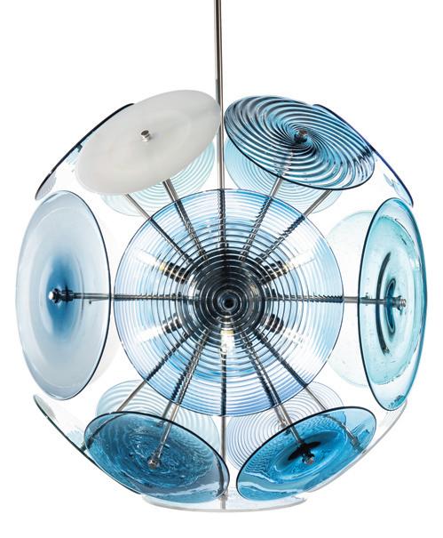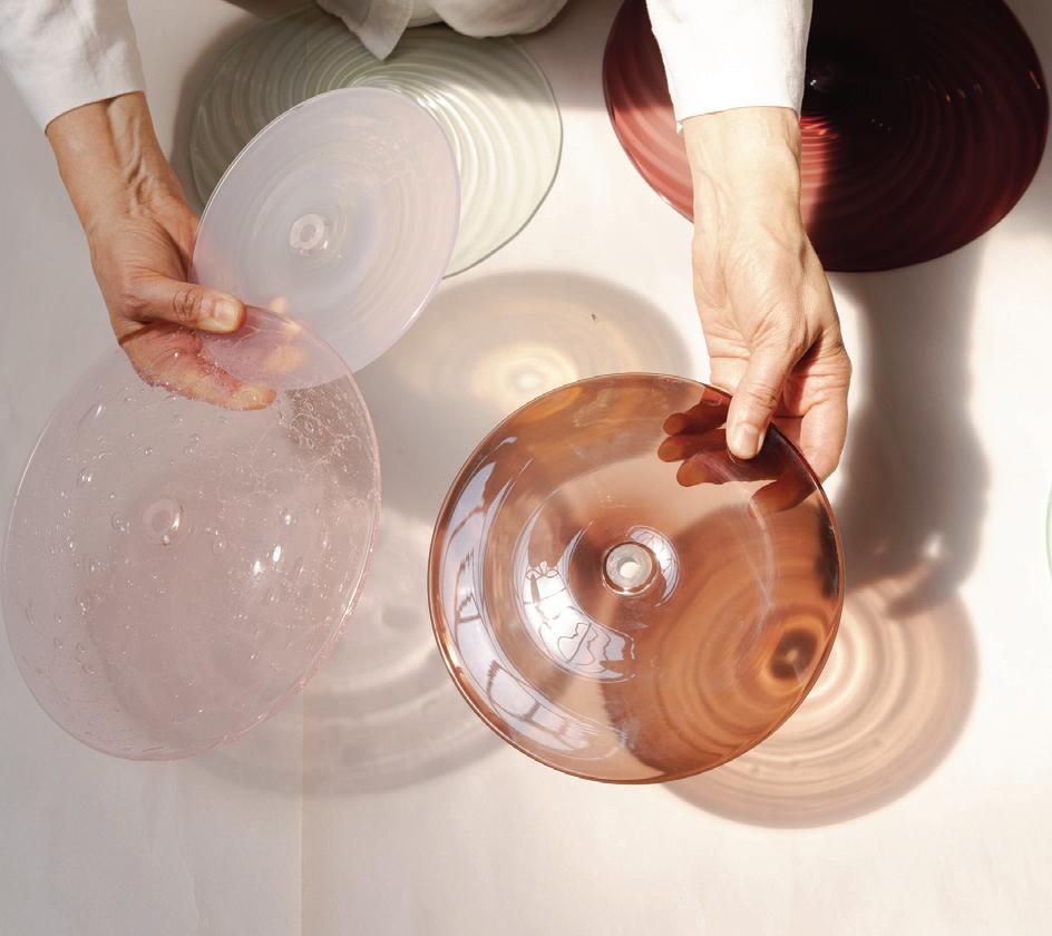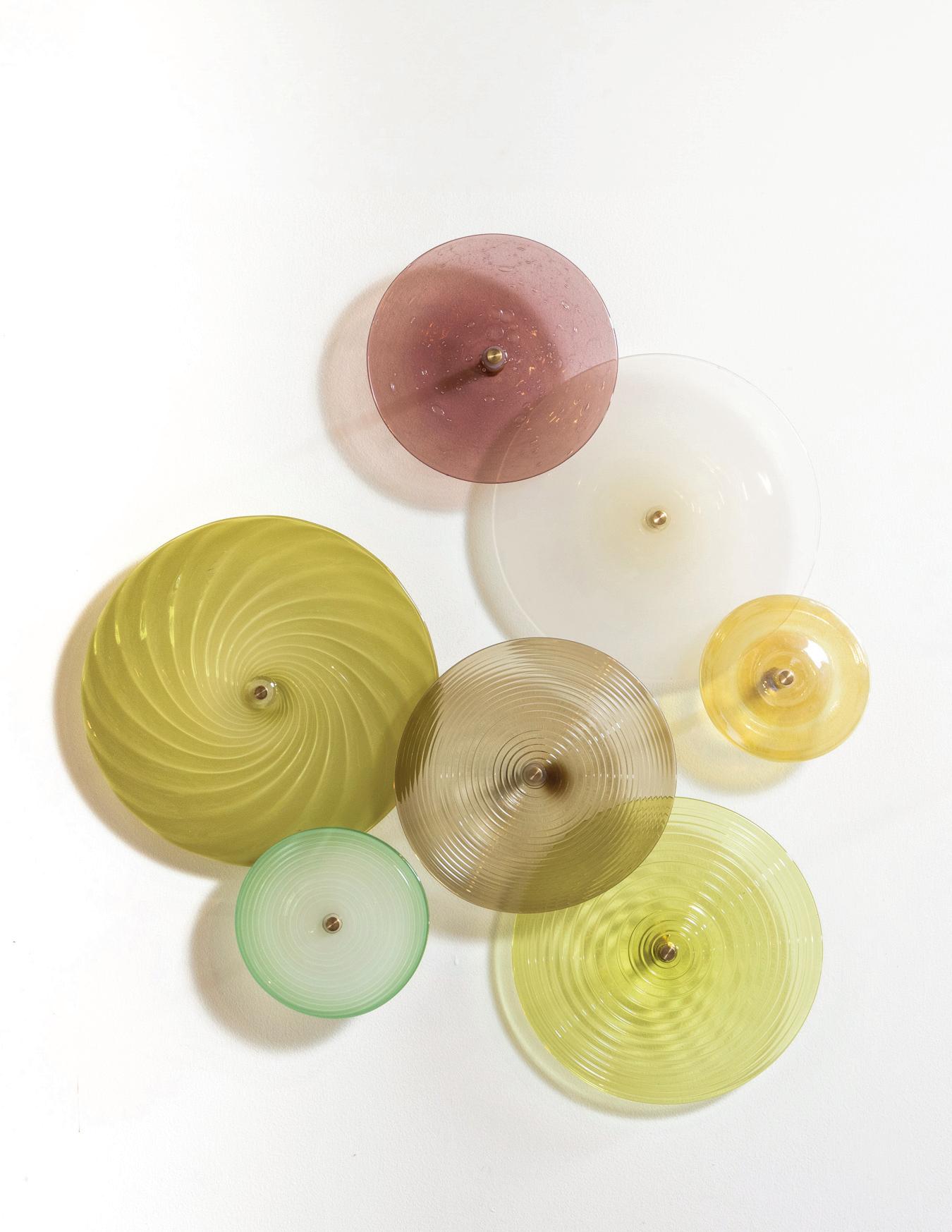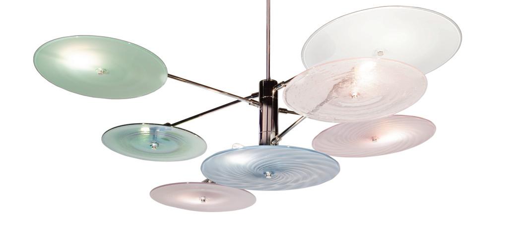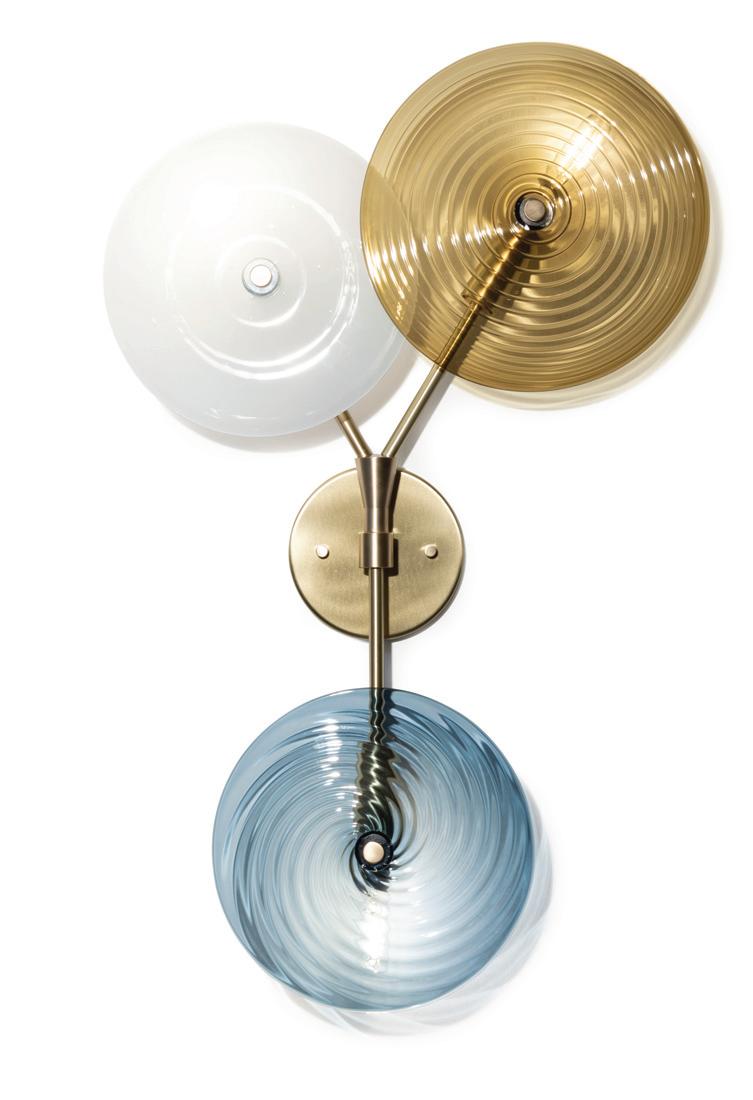 Light in motion. Inspired by the way light bends and radiates through glass, Lens explores depth and symmetry through softly glowing, hand-formed discs that shift in character from every angle.