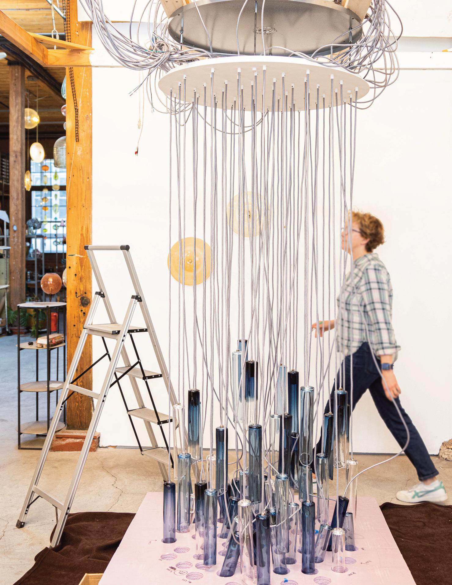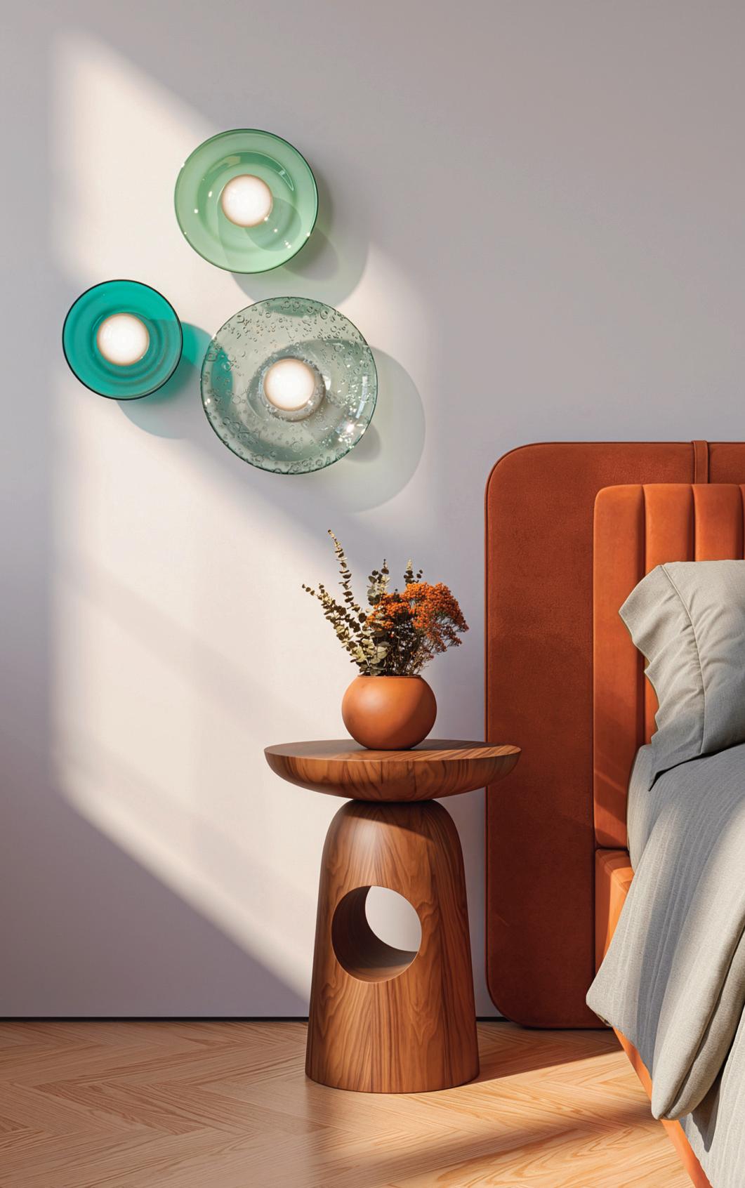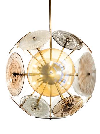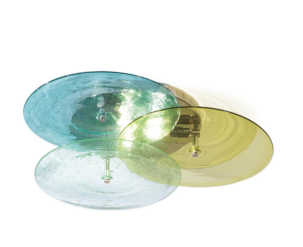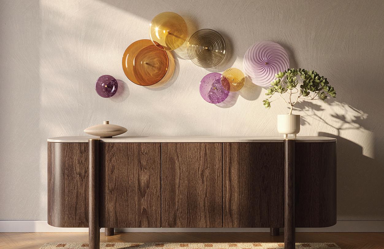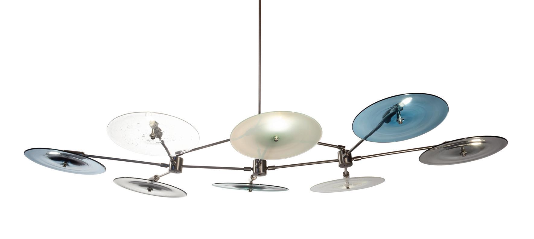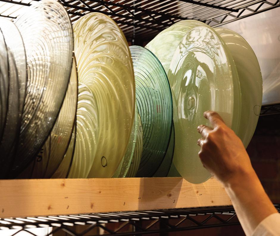 Light in motion. Inspired by the way light bends and radiates through glass, Lens explores depth and symmetry through softly glowing, hand-formed discs that shift in character from every angle.