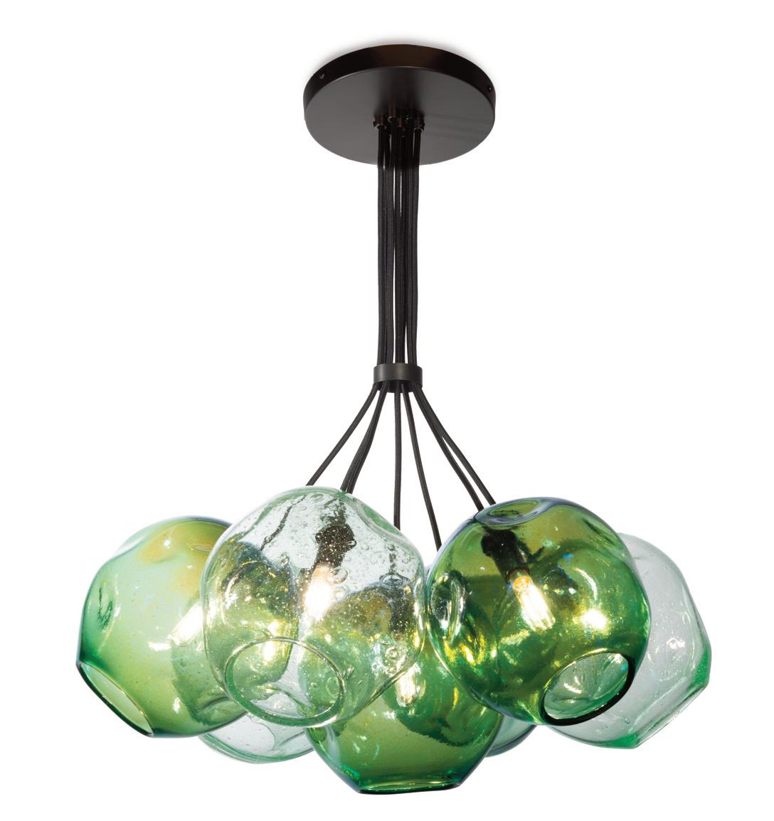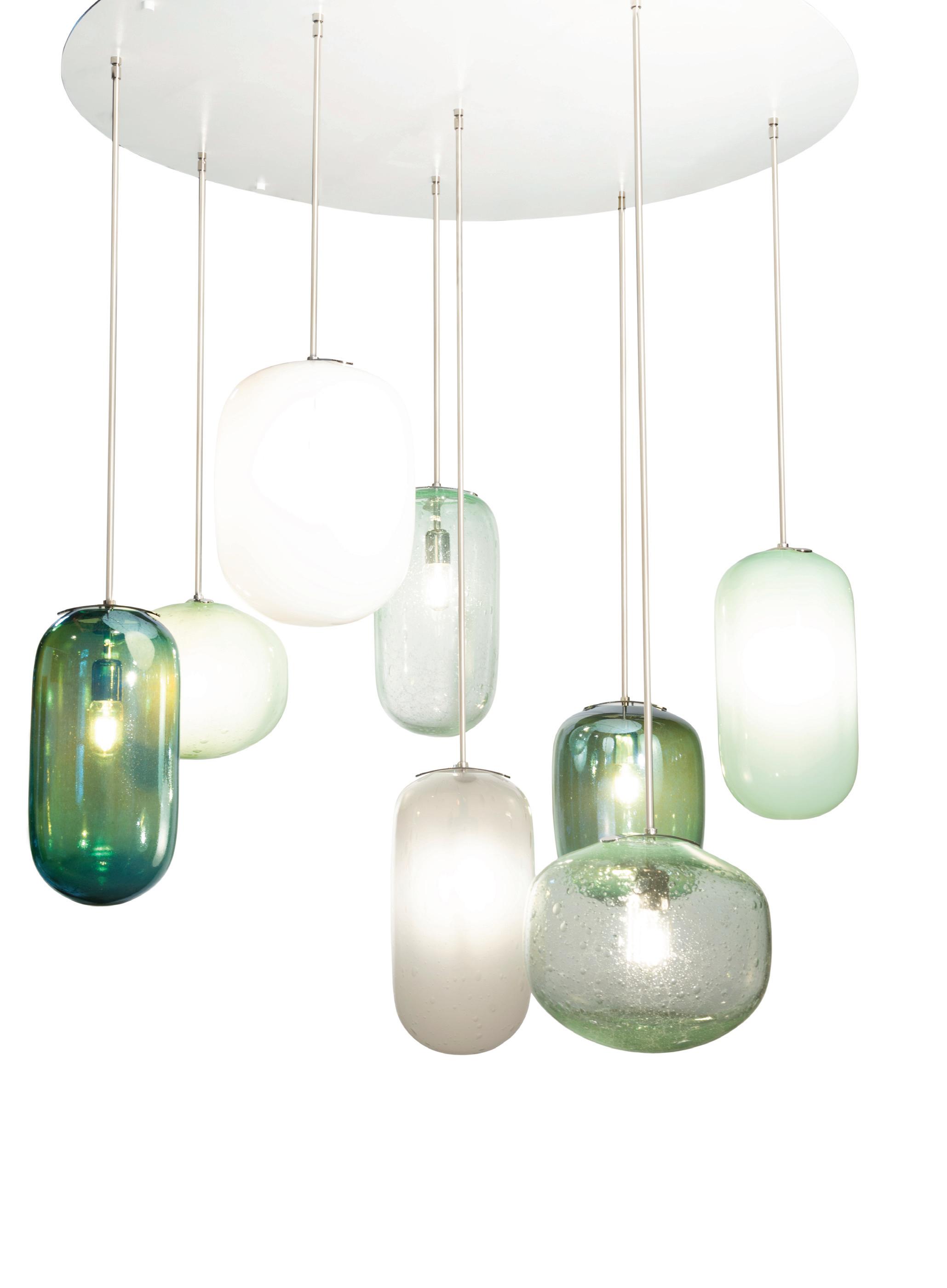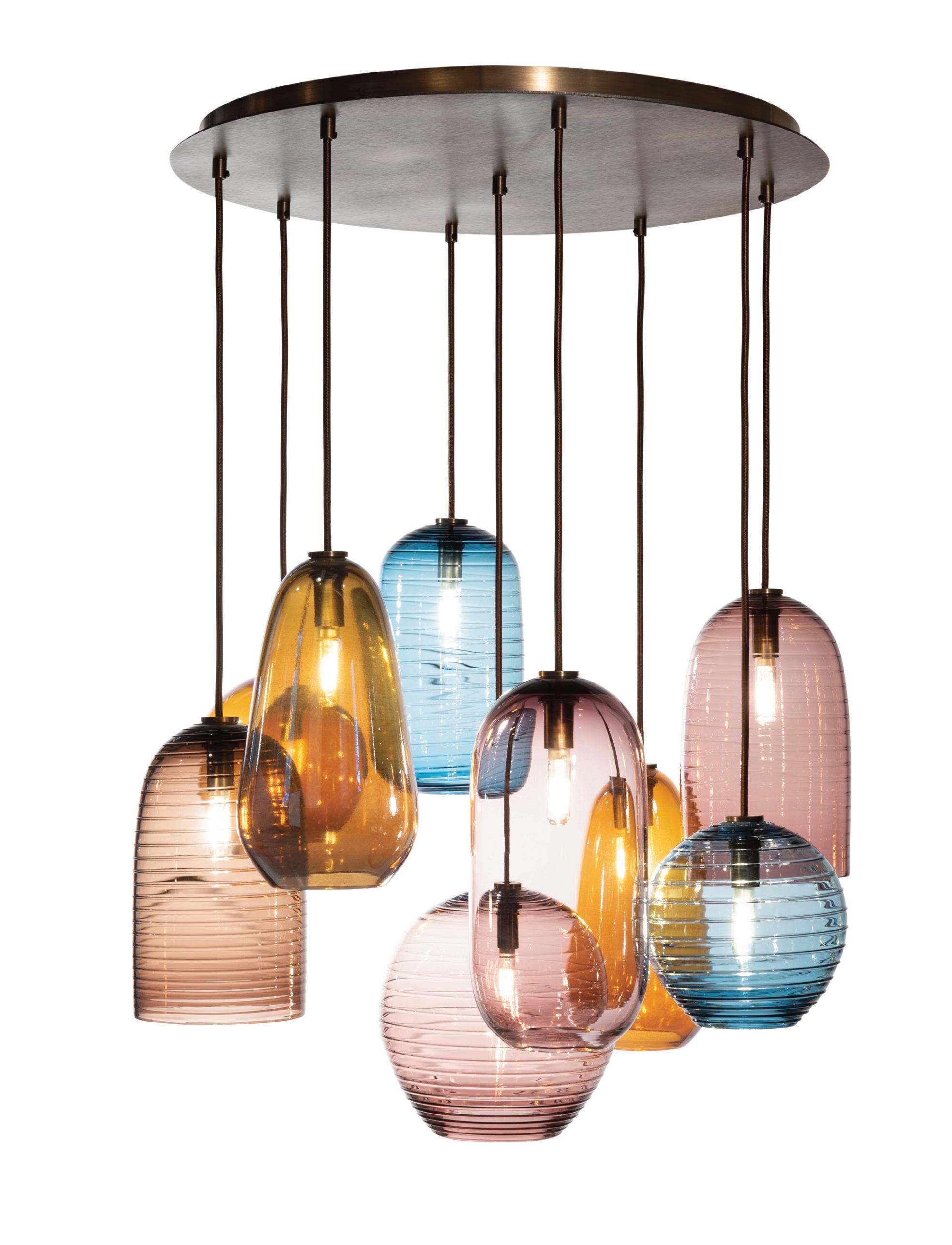 Cluster chandeliers assemble Globes, Dimples, or Cones on a compact canopy, allowing the glass to fan outward and form a sculptural volume of light.