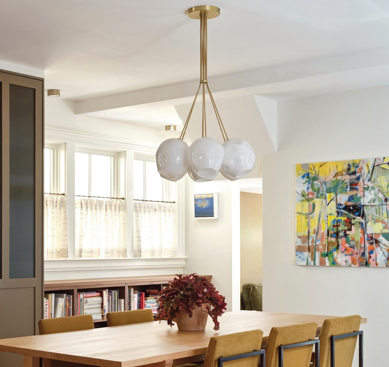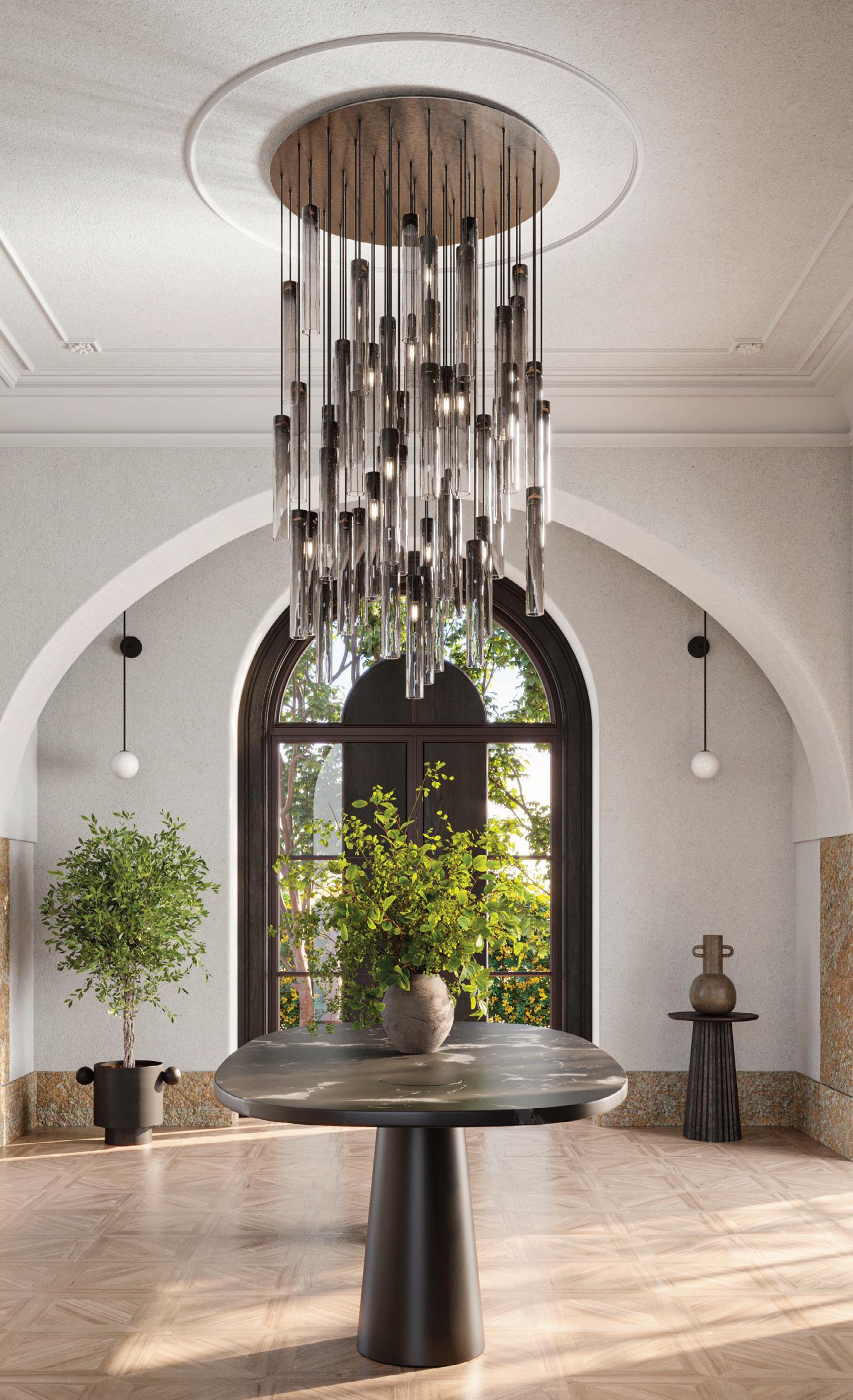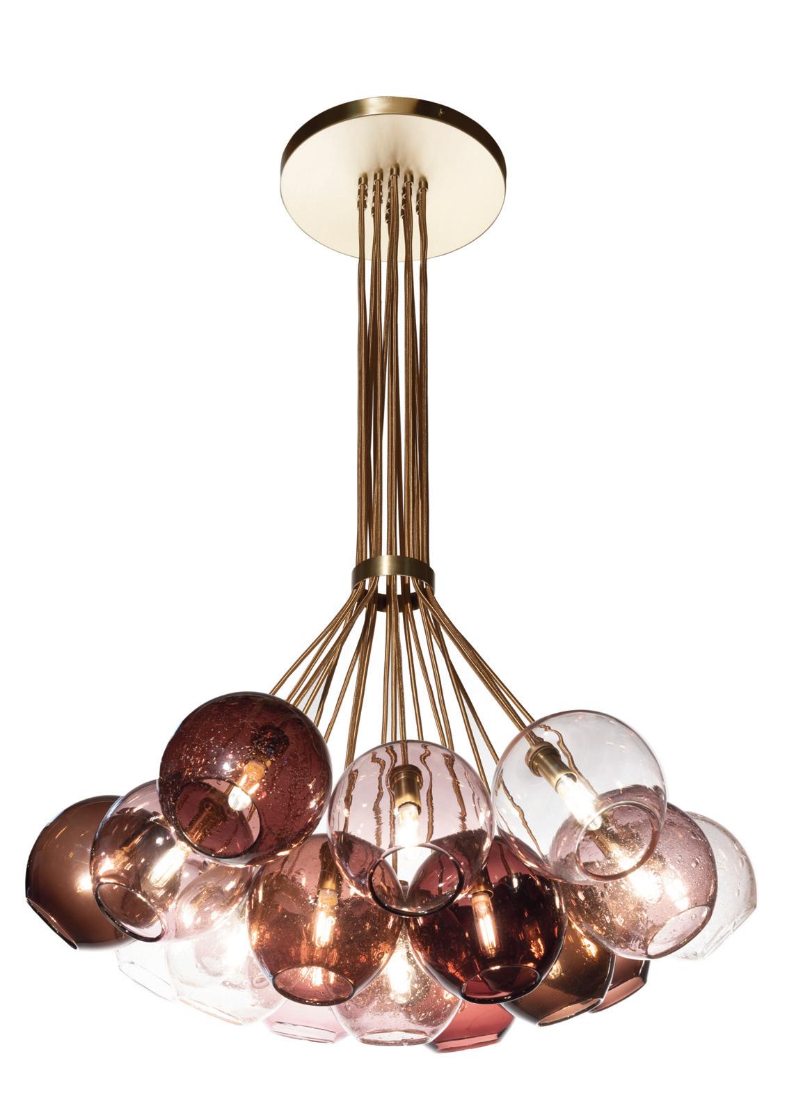 Cluster chandeliers assemble Globes, Dimples, or Cones on a compact canopy, allowing the glass to fan outward and form a sculptural volume of light.