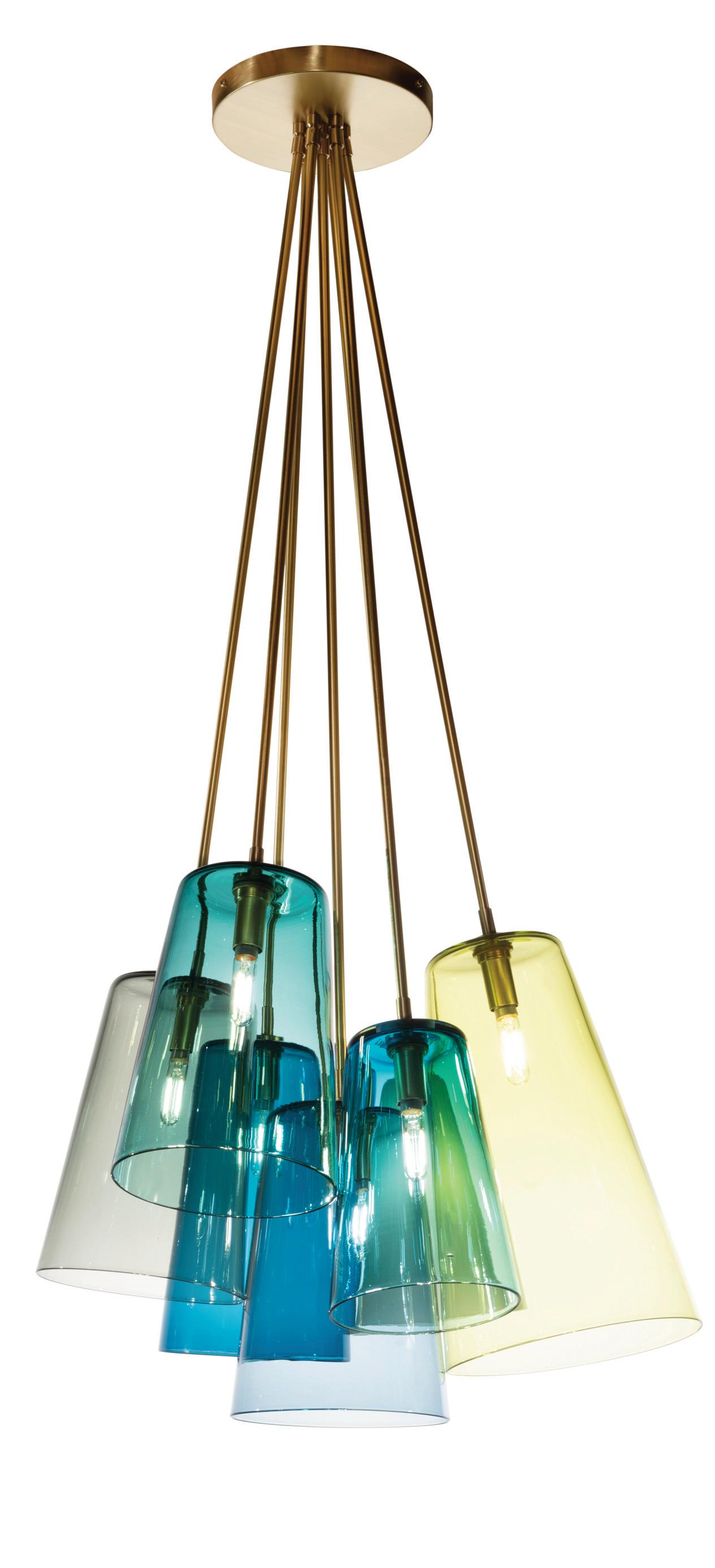 Cone Cluster 7: Cones in a mix of Grey, Sea Blue, Celadon, Celery, Turquoise, Steel Blue, and Tourmaline Smooth with Brushed Brass downrods