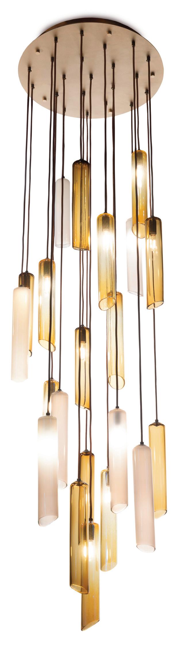 Rain, 22" diameter canopy: (22) Rain cylinders in a mix of Latte, Sargasso, and Gold Lustre with Antiqued Brass
