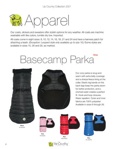 Apparel Our coats, slickers and sweaters offer stylish options for any weather. All coats are machine washable with like colors, tumble dry low. Imported. All coats come in eight sizes: 8, 10, 12, 14, 16, 18, 21 and 24 and have a harness patch for attaching a leash. (Exception: Leopard style only available up to size 16.) Some styles are available in sizes 15, 26 and 28, as marked.