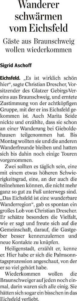 Das Eichsfelder Tageblatt der Thüringischen Landeszeitung hat am folgenden Montag (23. September) ein Interview mit unserer Wandergruppe und unserem Vorsitzenden bei der Eröffnungsfeier des 122. Deutschen Wandertags am vorherigen Donnerstag abgedruckt (siehe nächste Seite).