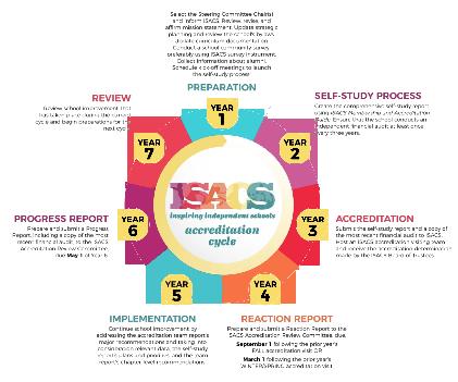 ISACS accreditation is a constant seven-year cycle. According to ISACS, the cycle is as follows: the first year consists of preparation, where any institution seeking accreditation will put together their committee chairs, conduct school community surveys, plan for the following years, as well as go through the schools bylaws to make sure they reflect what ISACS believes in. Year two consists of the self-study process, where the school will conduct various student, faculty, and even alumni surveys and put together the various reports for the different departments and opportunities the school has to offer.