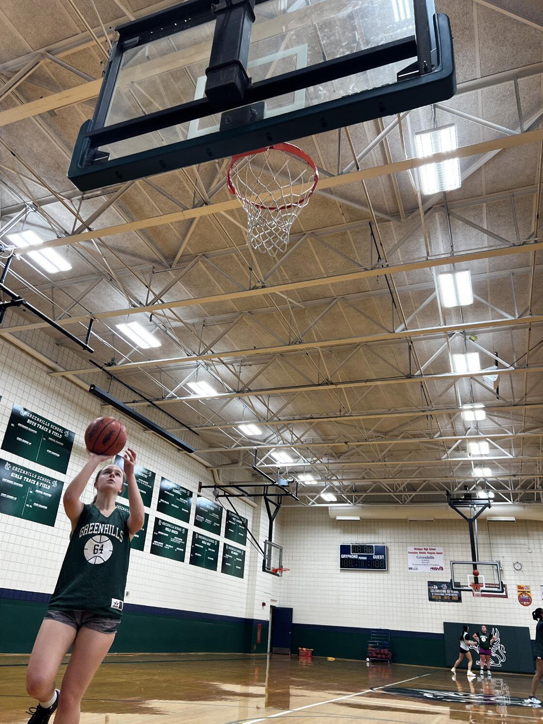 The squad ended last season with a loss in districts to Clinton 65-20, who were the top team in the region. The team took a hit early in that season when guard Meezan Hamzavi ‘23 went down with a season-ending injury in the third game. Hamzavi now plays basketball for Grinnell College, located in central Iowa. As the 2023-24 sea- son begins, the starting lineup of Katie Mal loure ‘24, Reewin Shi ‘24, Inaaya Naz meen ‘24, Hannah Behringer ‘25, and Alexi Magdich ‘26 is looking to rebound. Malloure said she is excited about this season with the Gryphons even though there are a lot of changes com ing to the team.