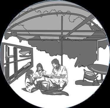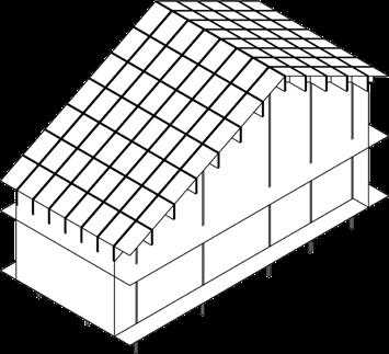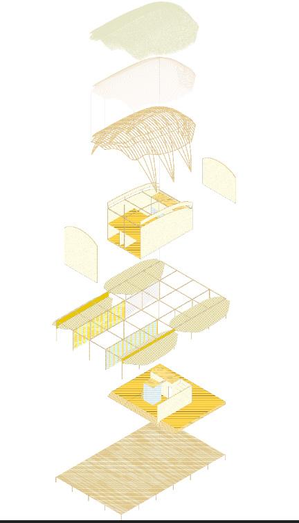 The axonometric rendering showcases a two-story modular housing unit. The open ground floor promotes communal living, while the upper level provides private spaces. Traditional materials like banana-fiber thatched roofing and bamboo frames honor the region’s cultural identity and tropical context. Sustainability is key, with locally sourced materials reducing the carbon footprint and climate-adaptive features such as large overhangs for rain protection and permeable shading for airflow.