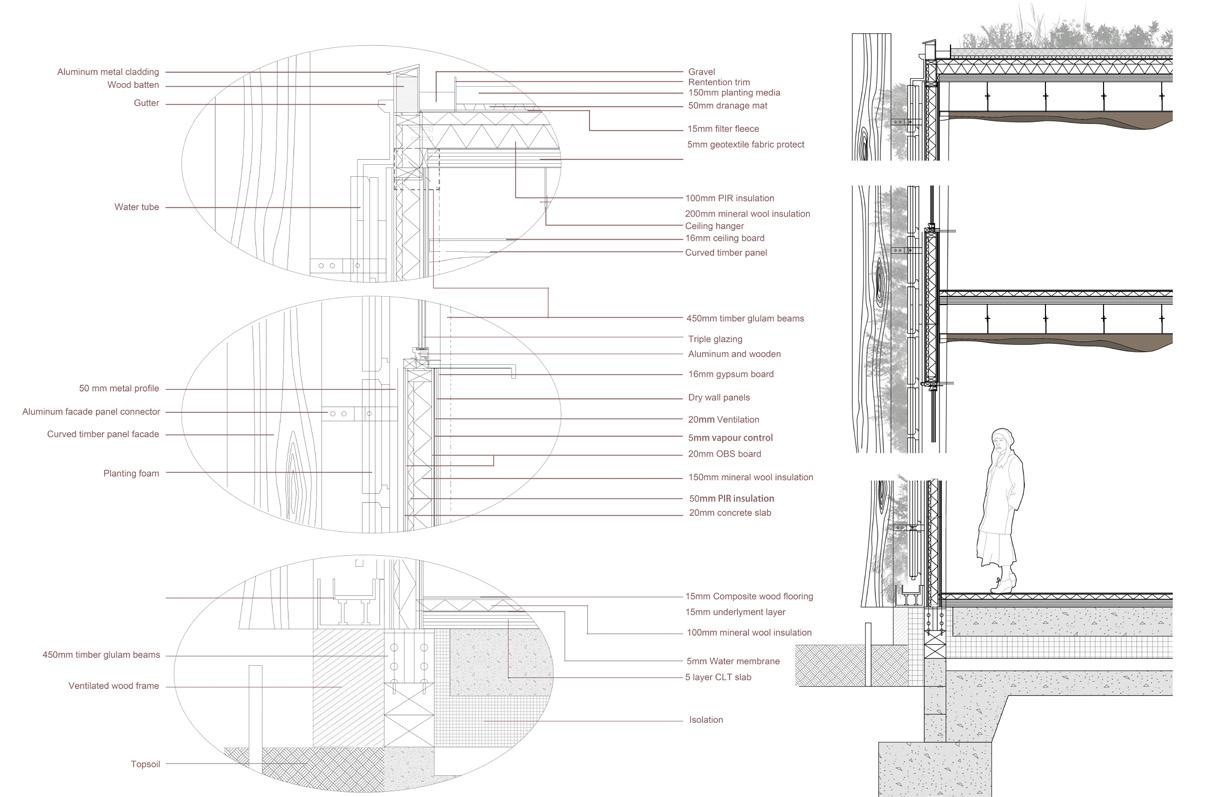 The second diagram is for Verdant Vista, illustrating the building’s facade and structural composition. It outlines a combination of materials, including curved timber panels, insulation, triple glazing, and CLT slabs. The diagram emphasizes aspects like ventilation, moisture control, and composite wood flooring, as well as the layered construction from the facade to the foundation.