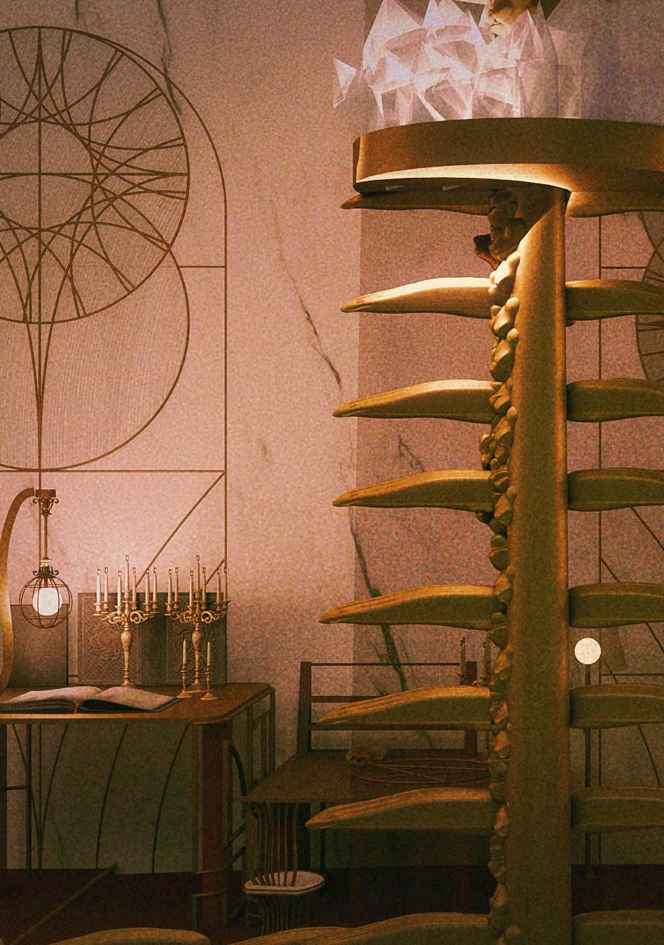 The design integrates Kabbalistic symbolism with Jung’s shadow concept, creating an immersive environment for spiritual introspection and creative transformation. The fragmented mirrors, symbolic textures, and interplay of light and shadow represent the tension between chaos and harmony, shadow and light, which are integral to the individuation process.