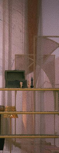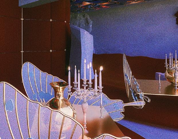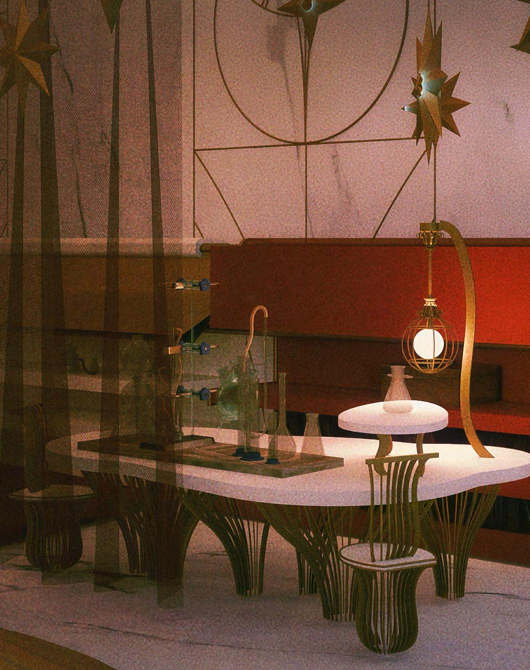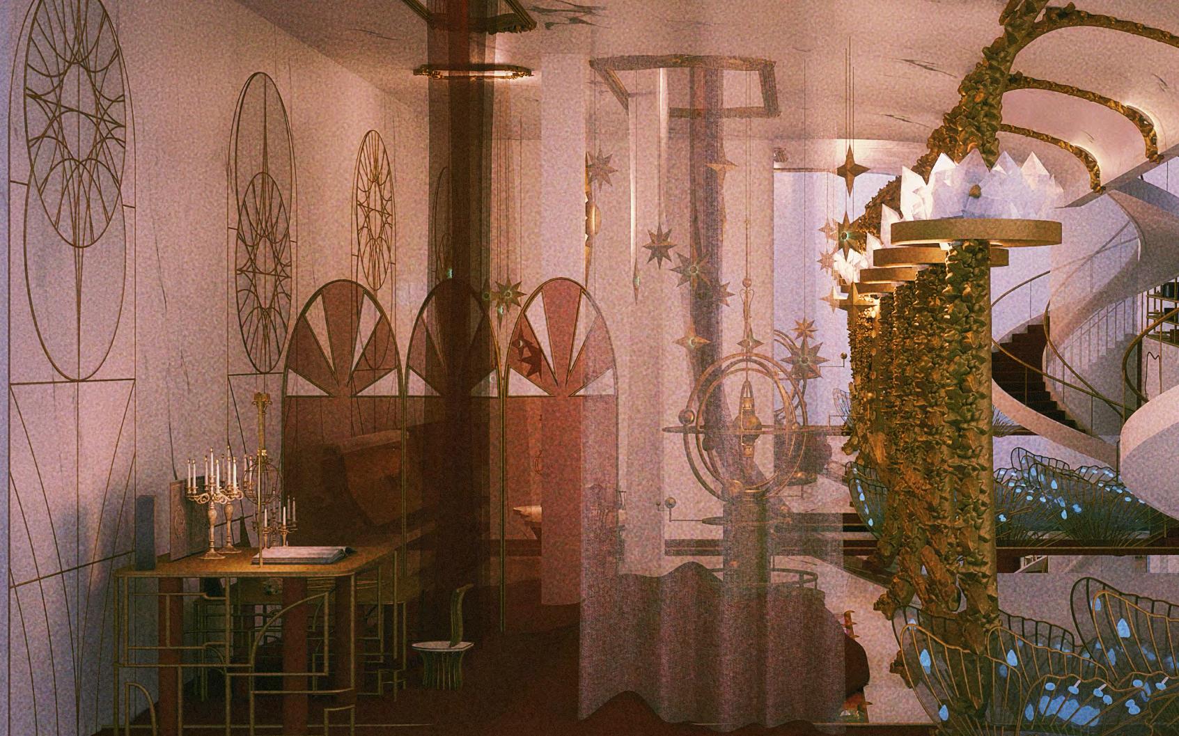 The occult room reflects Jung’s concept of the shadow as a gateway to creativity and self-realization. The open spaces, veiled by hanging fabrics, symbolize the interplay between concealment and revelation, mirroring the unconscious as vast yet elusive. Ceiling mirrors distort and fragment reflections, evoking the fractured psyche and inviting self-examination, while the dynamic interplay of light and shadow captures the fluid nature of inner transformation. The dragon spine columns anchor the space with raw, primal energy, representing chaos and transformation, while their crystalline details symbolize moments of clarity. Star-like ornaments and sigils further tie the room to the themes of navigation and ascension, aligning with The Chariot Tarot card’s journey of discipline and balance. This room is both a physical and symbolic space for confronting the shadow, transforming darkness into vitality, and channelling Bowie’s fascination with mysticism and the unconscious into creative expression.