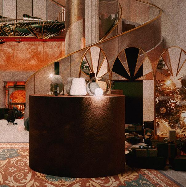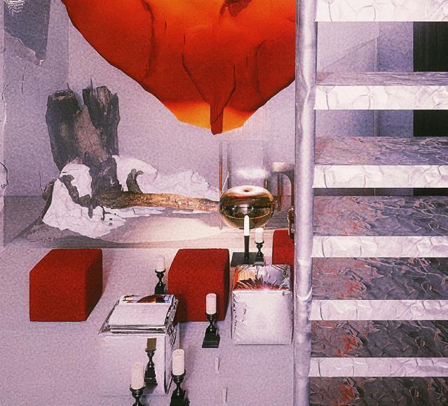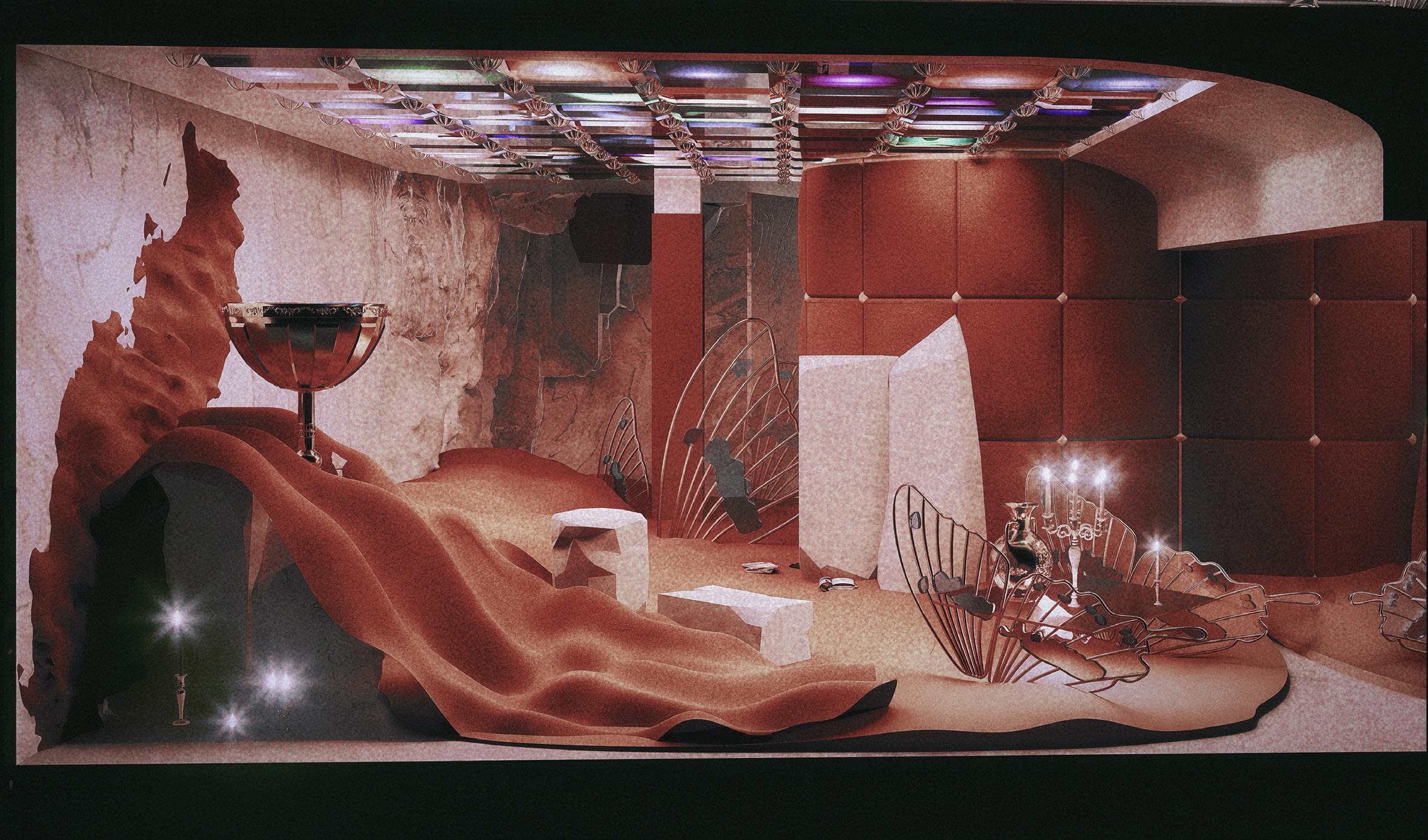 The Drug Room explores Bowie’s darker experiences, with undulating red walls and velvet carpets symbolizing the chaos of addiction. Butterfly elements evoke fleeting beauty and the fragility of existence. The space functions as both a confessional and a physical manifestation of confronting the inner shadow. Mirrored screens and layered textures represent confusion and reflection, offering potential clarity amid turmoil. In the heart of Hod, Bowie lies alone, surrounded by pulsing crimson walls that reflect fragmented personas, a soul seeking integration.