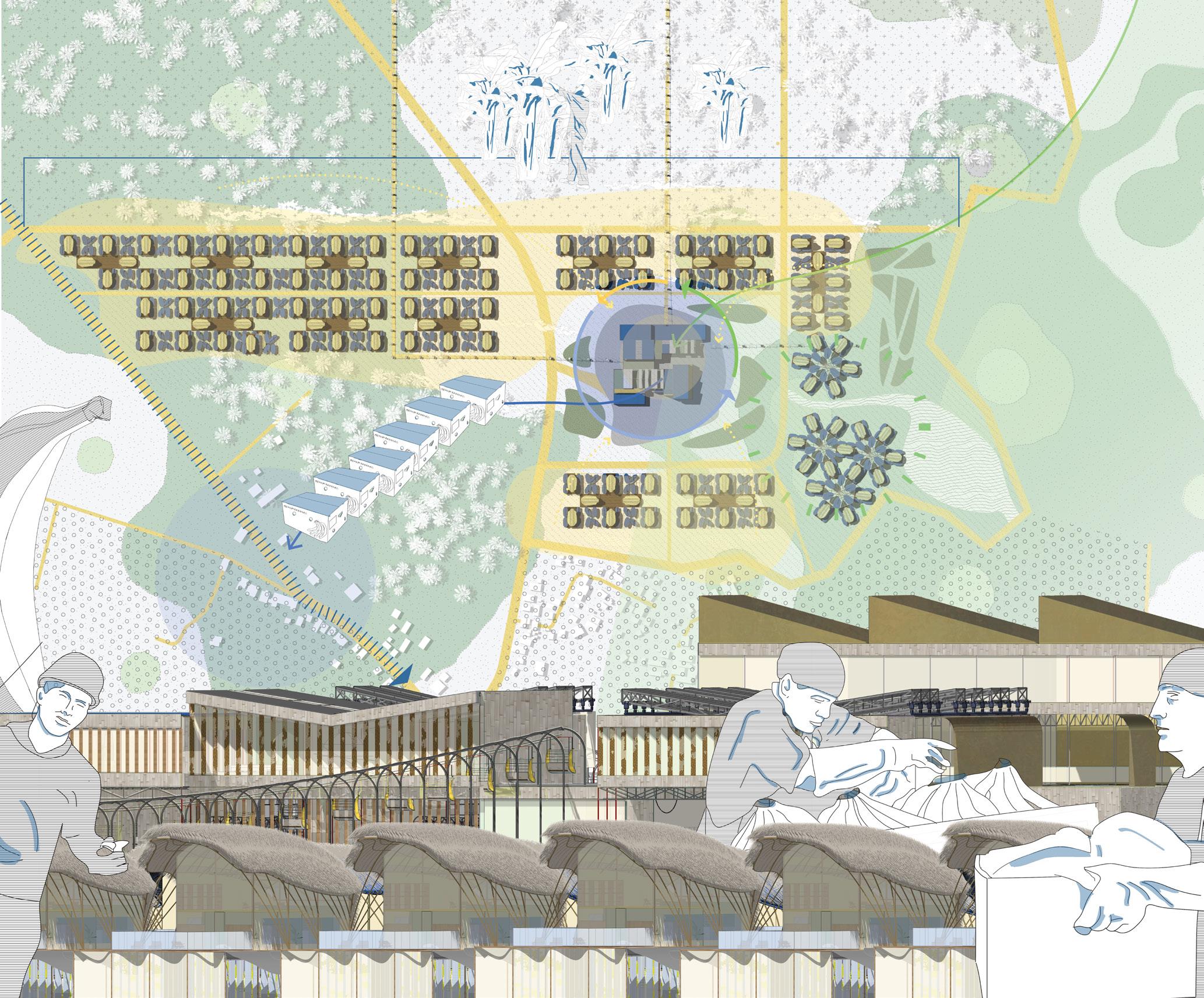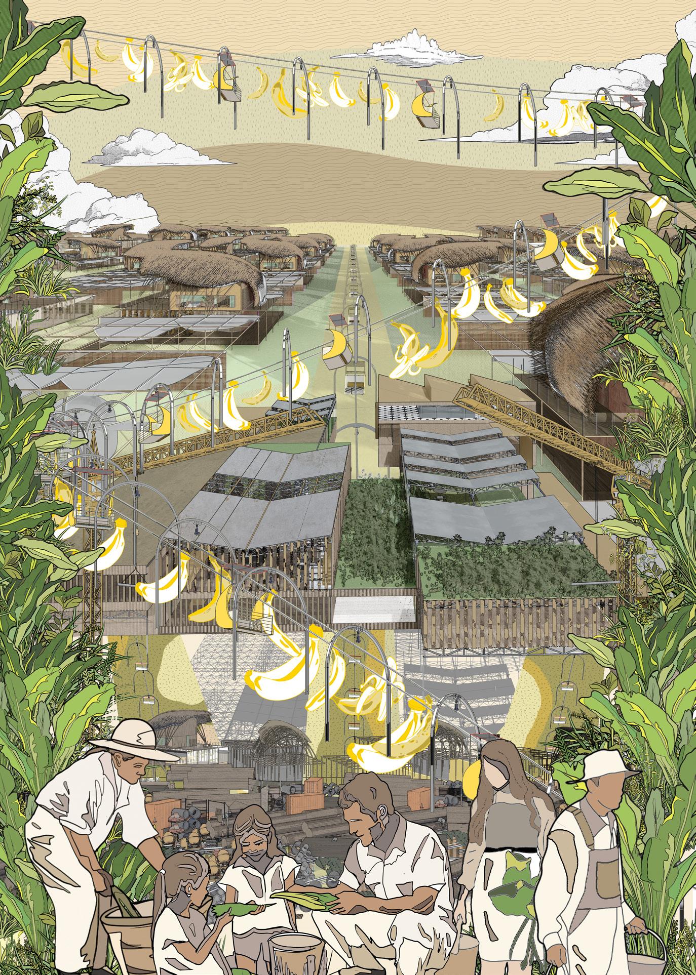 Inspired by the unique qualities of banana trees—particularly their strong yet flexible nature, their ability to thrive in a diverse range of conditions, and their essential role in the local ecosystem—”Leaf & Loom” proposes a community of modular units. These units are designed with banana leaf-shaped roofs, bamboo frames, and other natural materials that reflect the vernacular architecture of the region, while also allowing for future flexibility as families grow and community needs evolve.