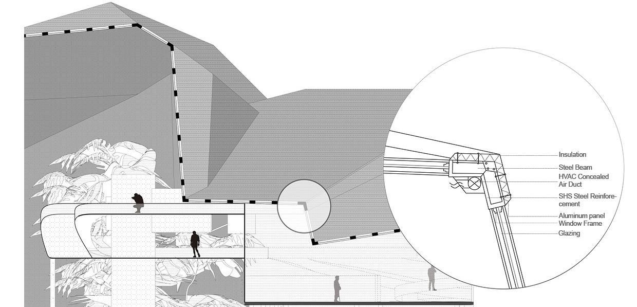 The axonometric diagram focuses on the composition and functionality of the factory area, emphasizing its modular design and adaptability. They highlighted the column-free spaces enabled by long-span trusses, creating an expansive and flexible production environment. Key details, such as movable roof systems, enhance ventilation and natural light while reflecting sustainable design principles. The factory layout is optimized with clearly defined zones for processing, packaging, and storage, seamlessly integrated with loading bays for efficient product distribution. These diagrams capture the innovation and practicality embedded in the factory’s design, showcasing it as the heart of the plantation’s operations.