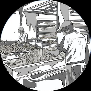 Packaged bananas are stored in refrigerated units to maintain freshness. Shipped via trucks, ships, or aeroplanes.