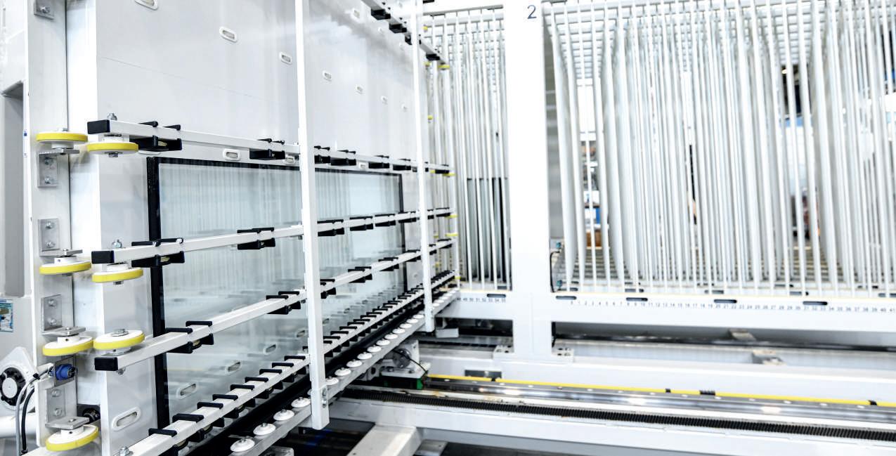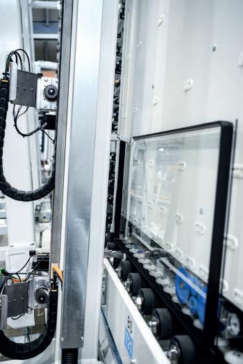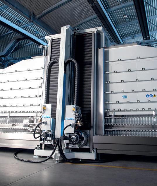 It’s a step toward total automation because no manual intervention is employed to offload and sort postproduction IGU’s. After the sealing phase, patented supports are positioned underneath the insulating glass panel to allow it to move directly to the automatic warehouse completely upright in a 90-degree vertical position, without the risk of any deformation and for accurate completion of the catalysation stage.