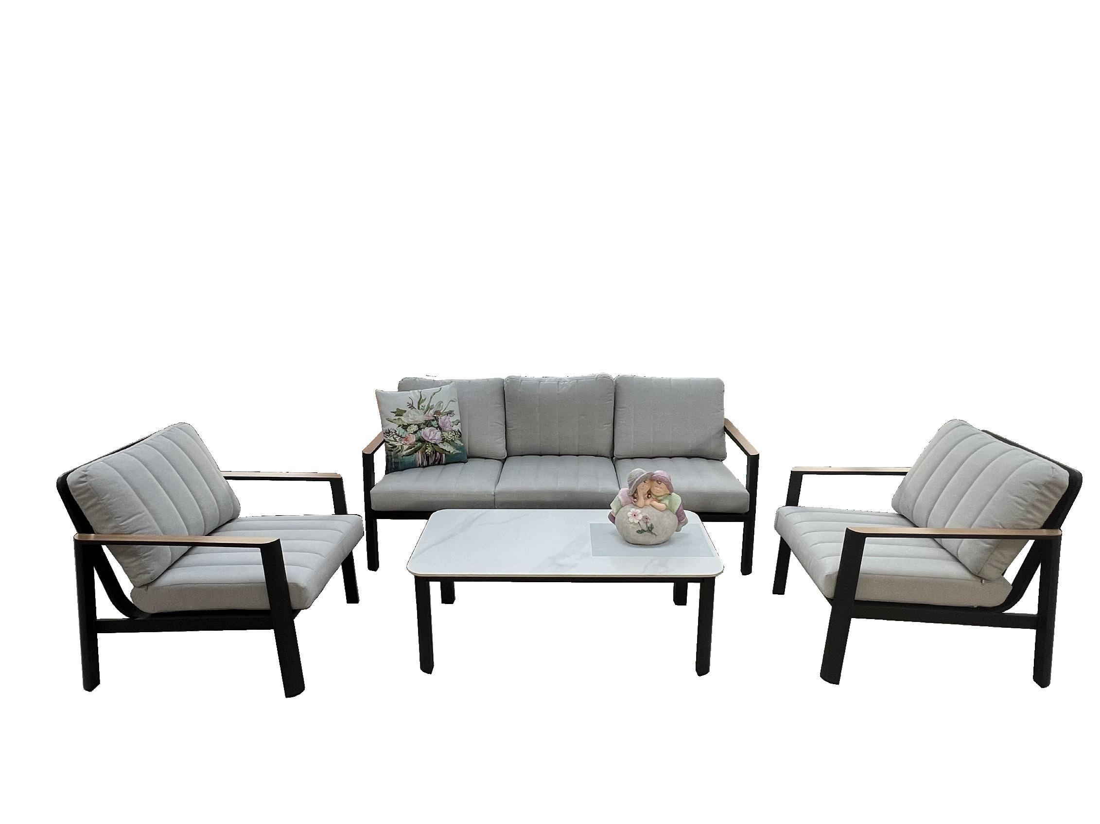 con struttura in alluminio anodizzato nero e braccioli effetto legno. Il set è composto da divano 3 posti cm 190x82x79,5 h, 2 poltrone cm 70x82x79,5 h, e un tavolino da caffè cm 115x59,5x43 h, con top in gres effetto marmo. Il set comprende comodi cuscini color grigio chiaro