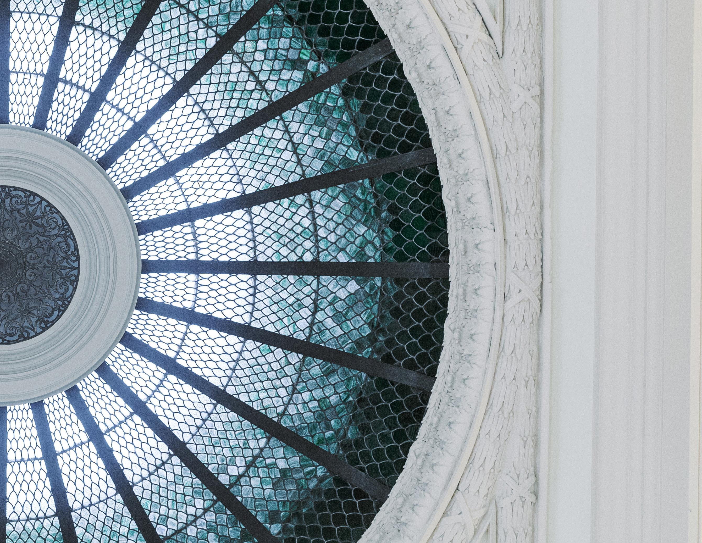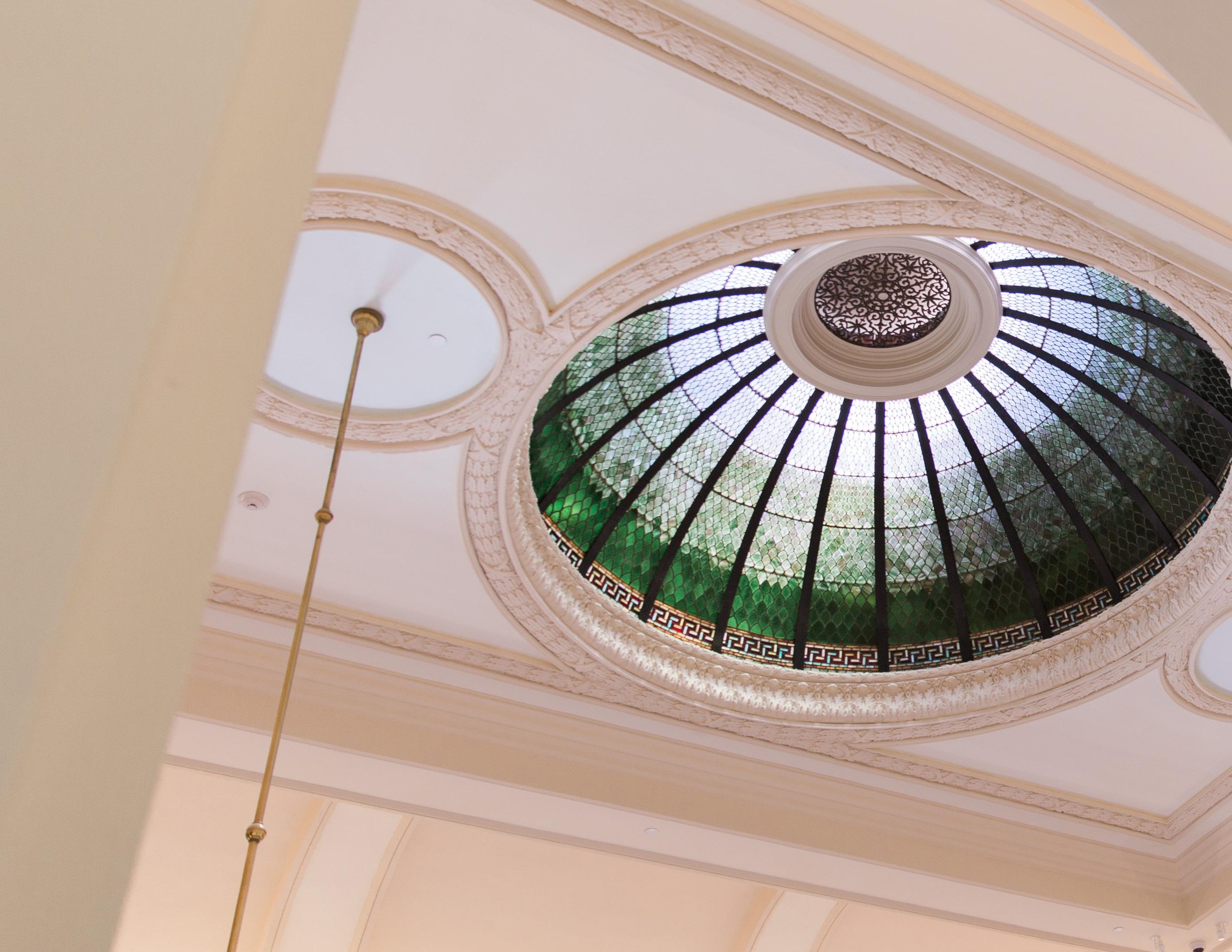 This 1,345 square foot sculpture hall lends itself to an intimate dinner setting or romantic wedding ceremony. The rotunda gallery is marked with its Tiffany-style art glass dome, porcelain tile floor, original light fixtures, and molding, and is truly the jewel of the Gibbes Museum.