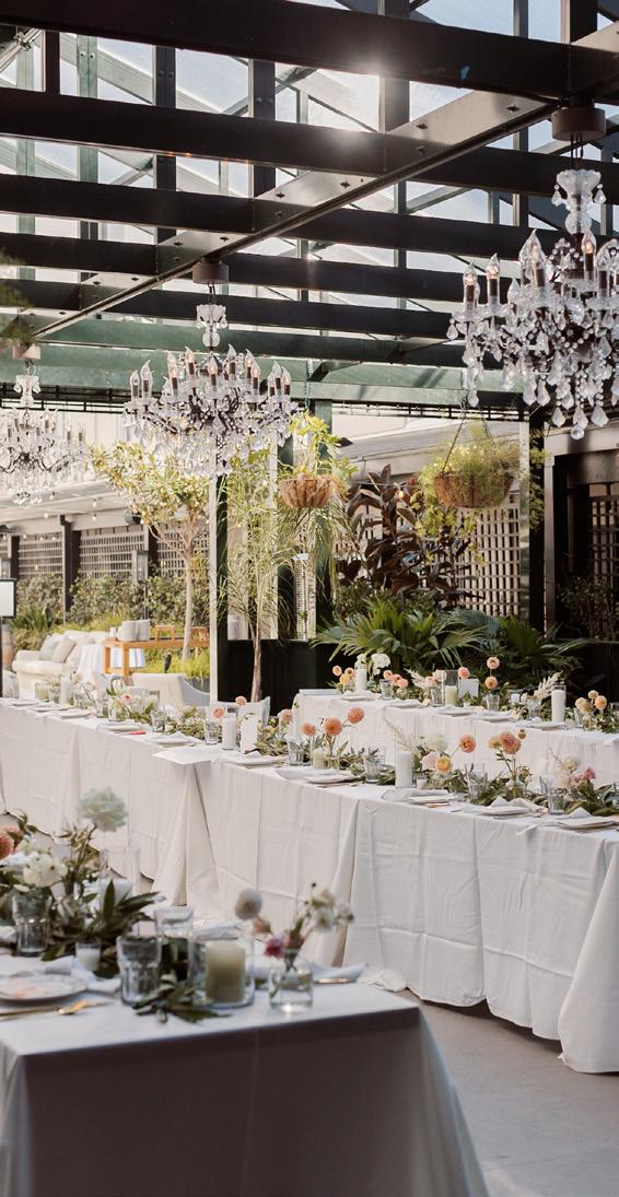 The reception hall offers a glass curtain wall providing views of the classical garden—the perfect backdrop for any private event. The exposed brick walls and rose marble flooring throughout exude a timeless elegance.